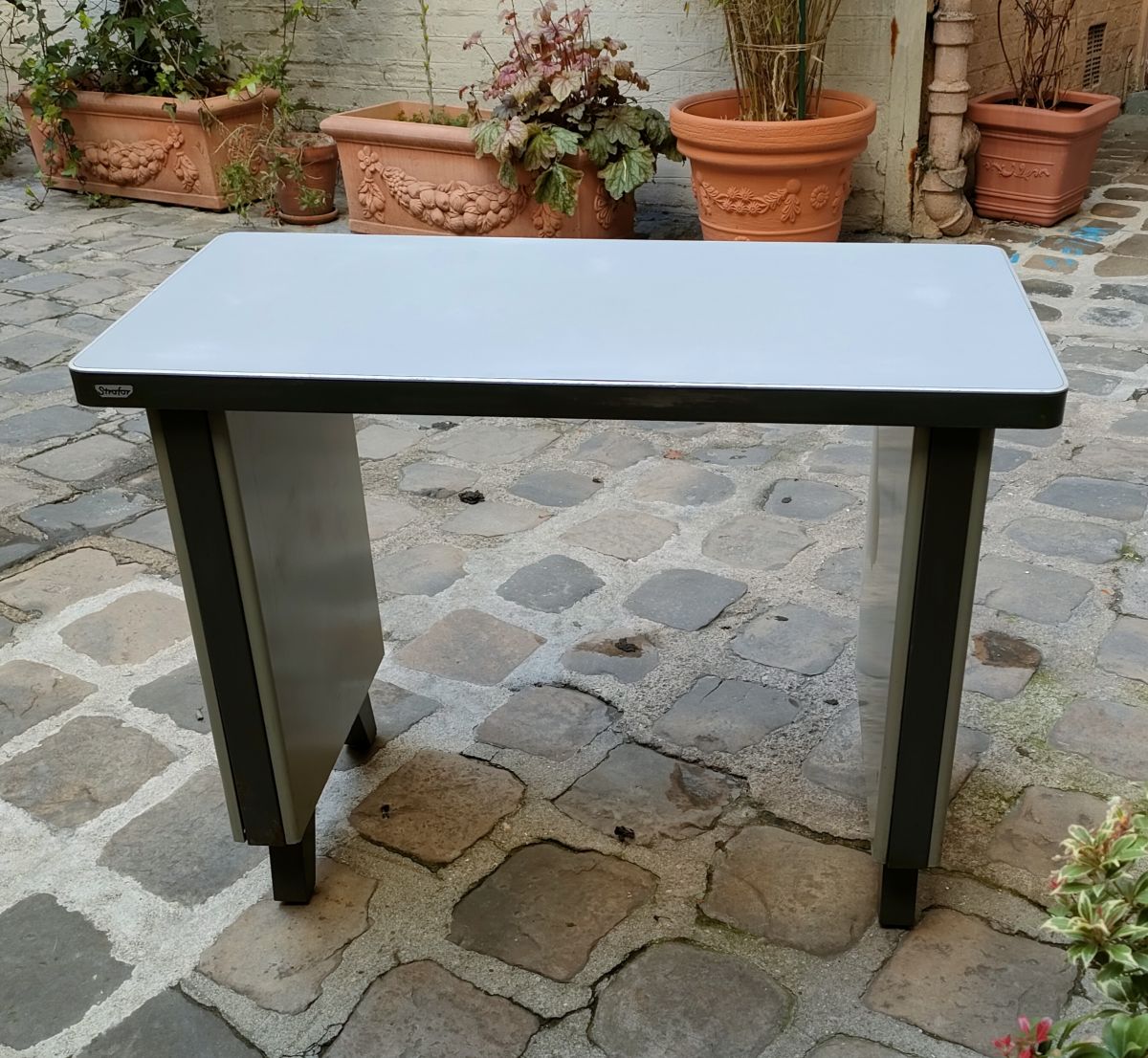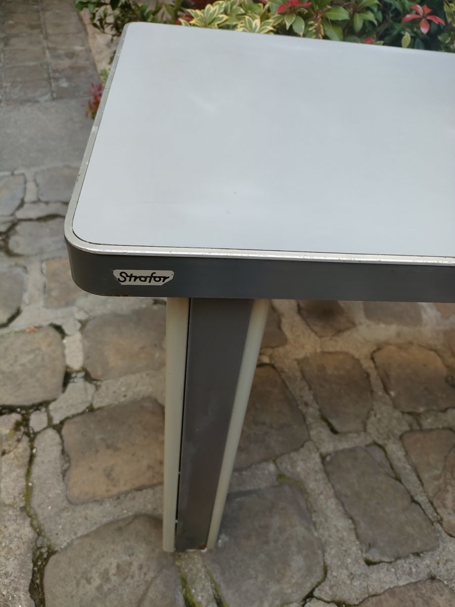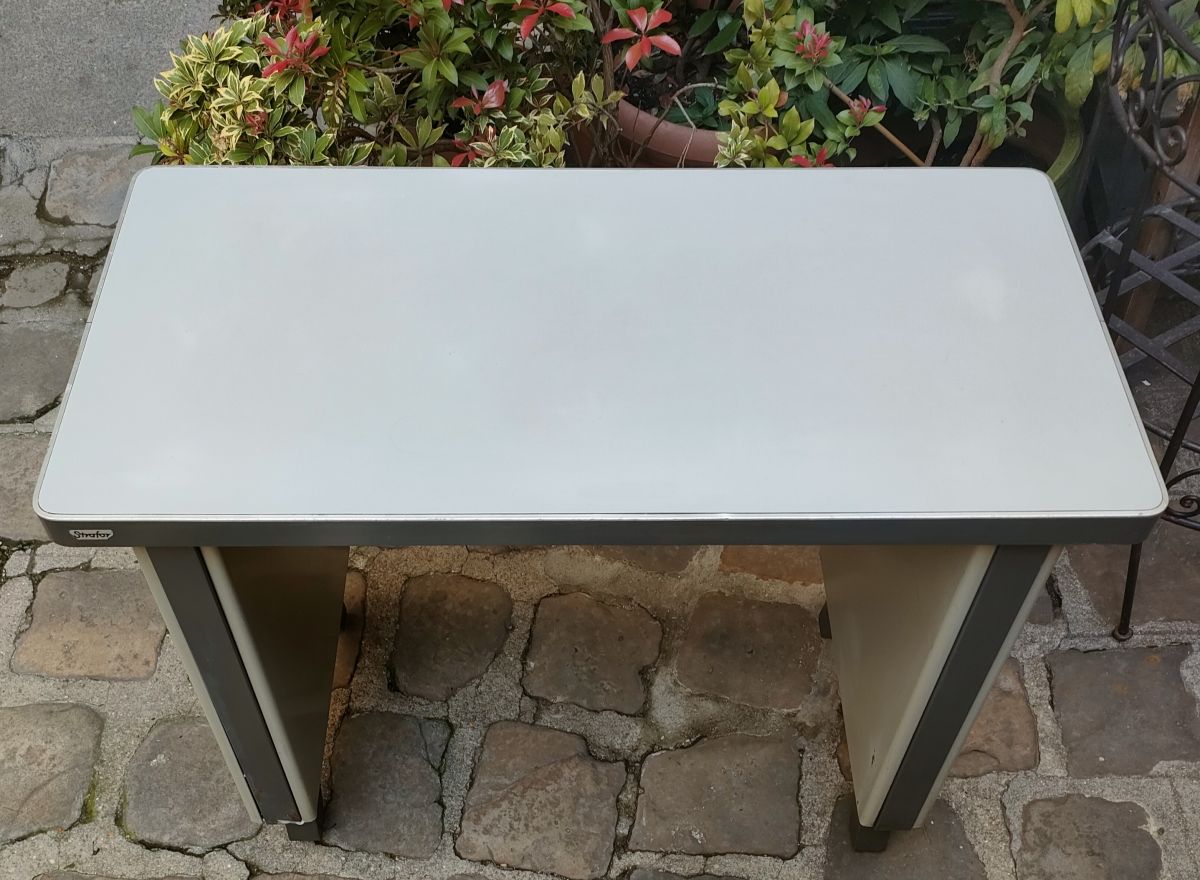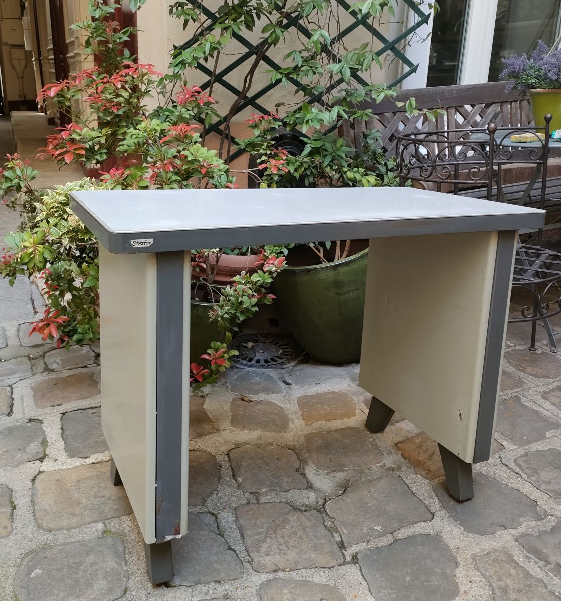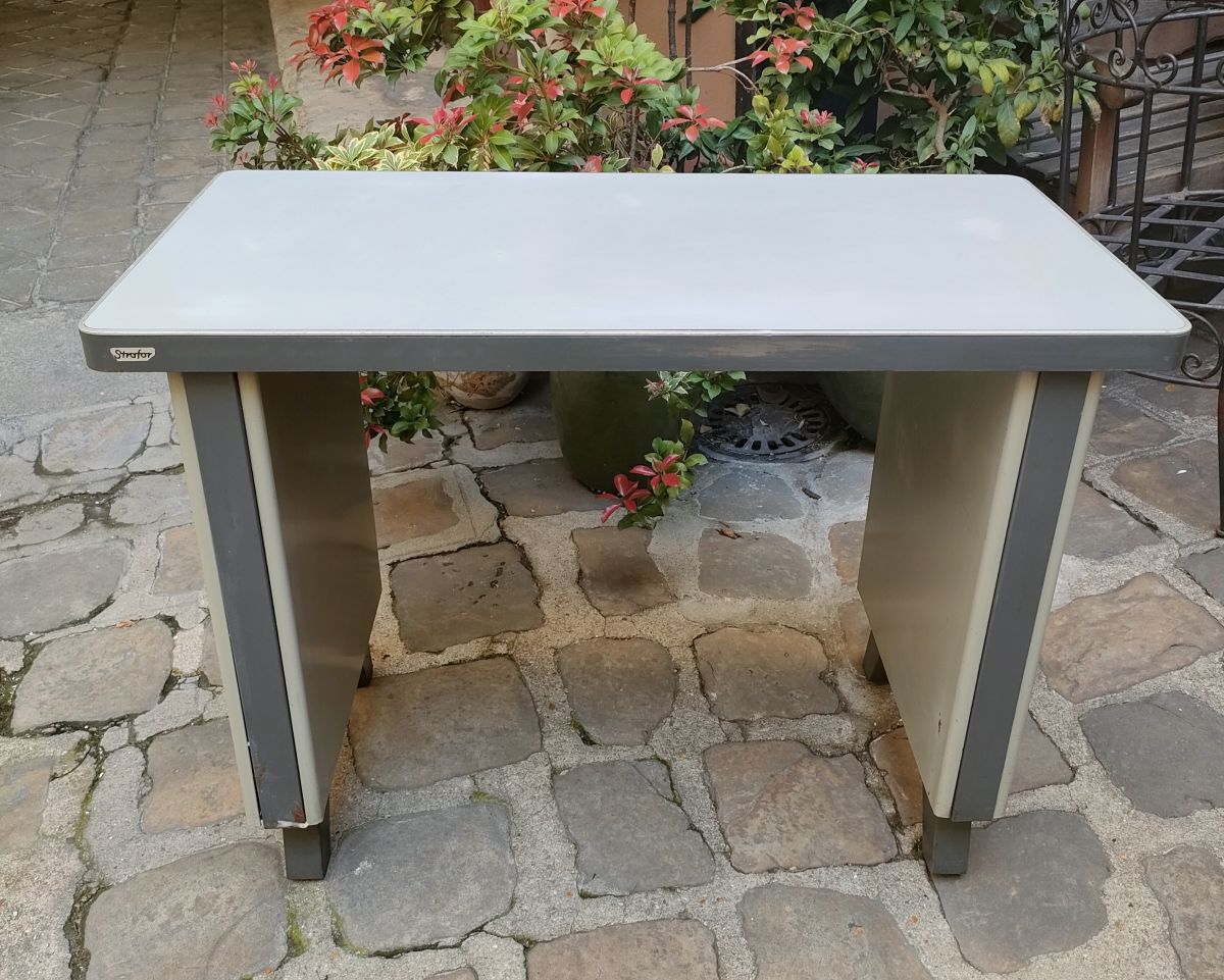 table d’appoint ou petit bureau vintage de la marque Strafor, de couleur grise, en bon état.