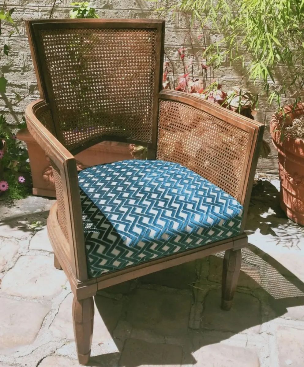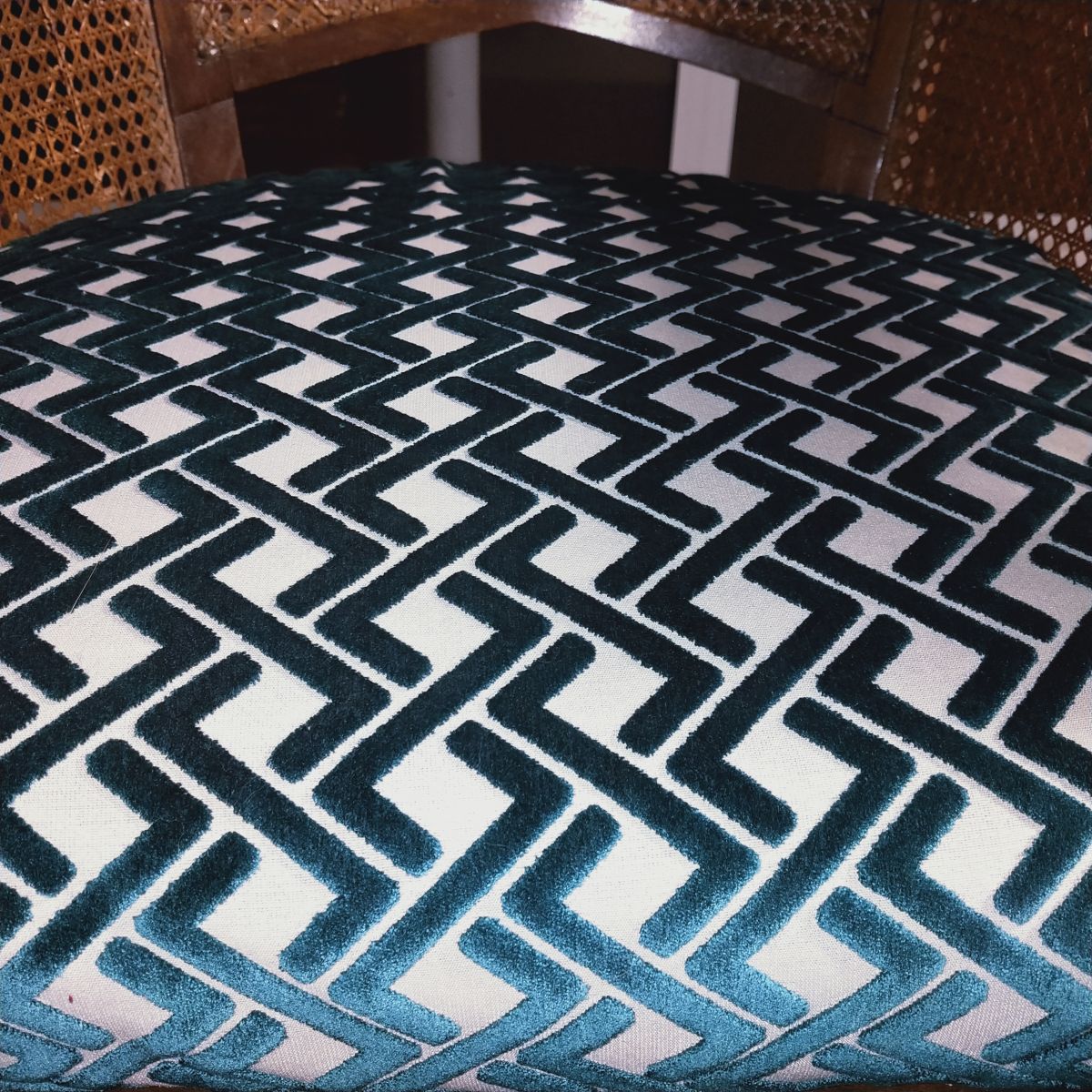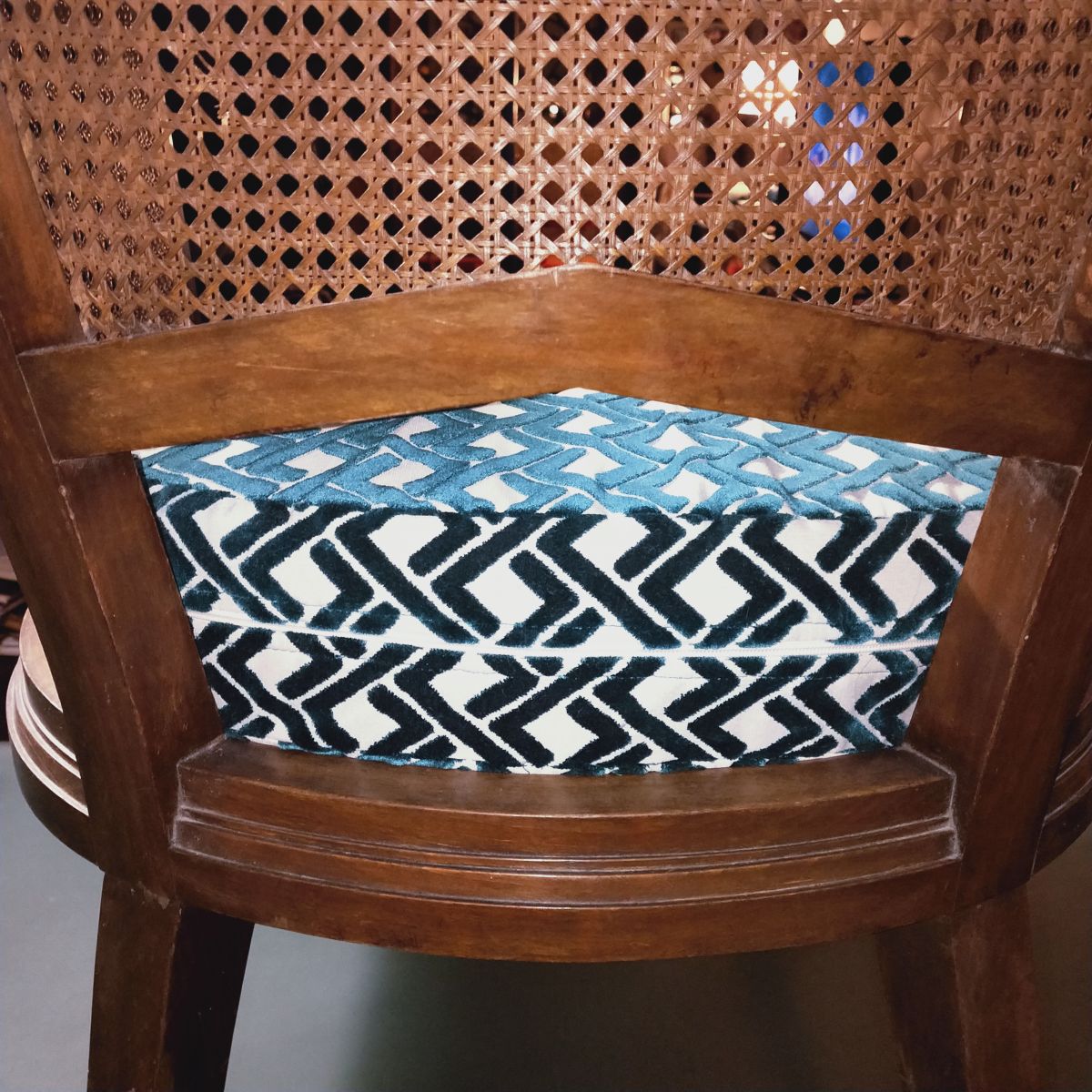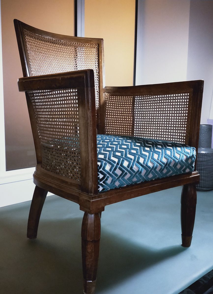 très beau fauteuil années 20 / 30 . Structure bois et cannage. Le cannage est d’origine et un peu abimé sur 3 endroits (partie la plus abîmée en photo ci jointe) mais globalement le fauteuil est en très bon etat. L’assise est en velours rouge bordeaux mais je viens de le faire recouvrir par un professionnel en déhoussable (housse zippée sur l’arrière). Tissu velours bleu canard en relief de chez Casamance. Vous avez ainsi 2 options pour l’assise.