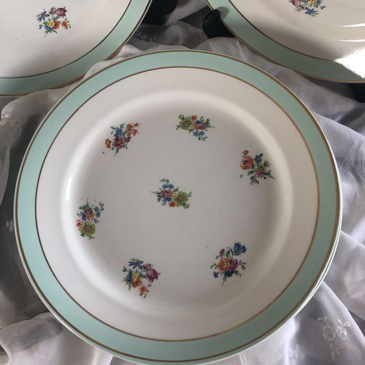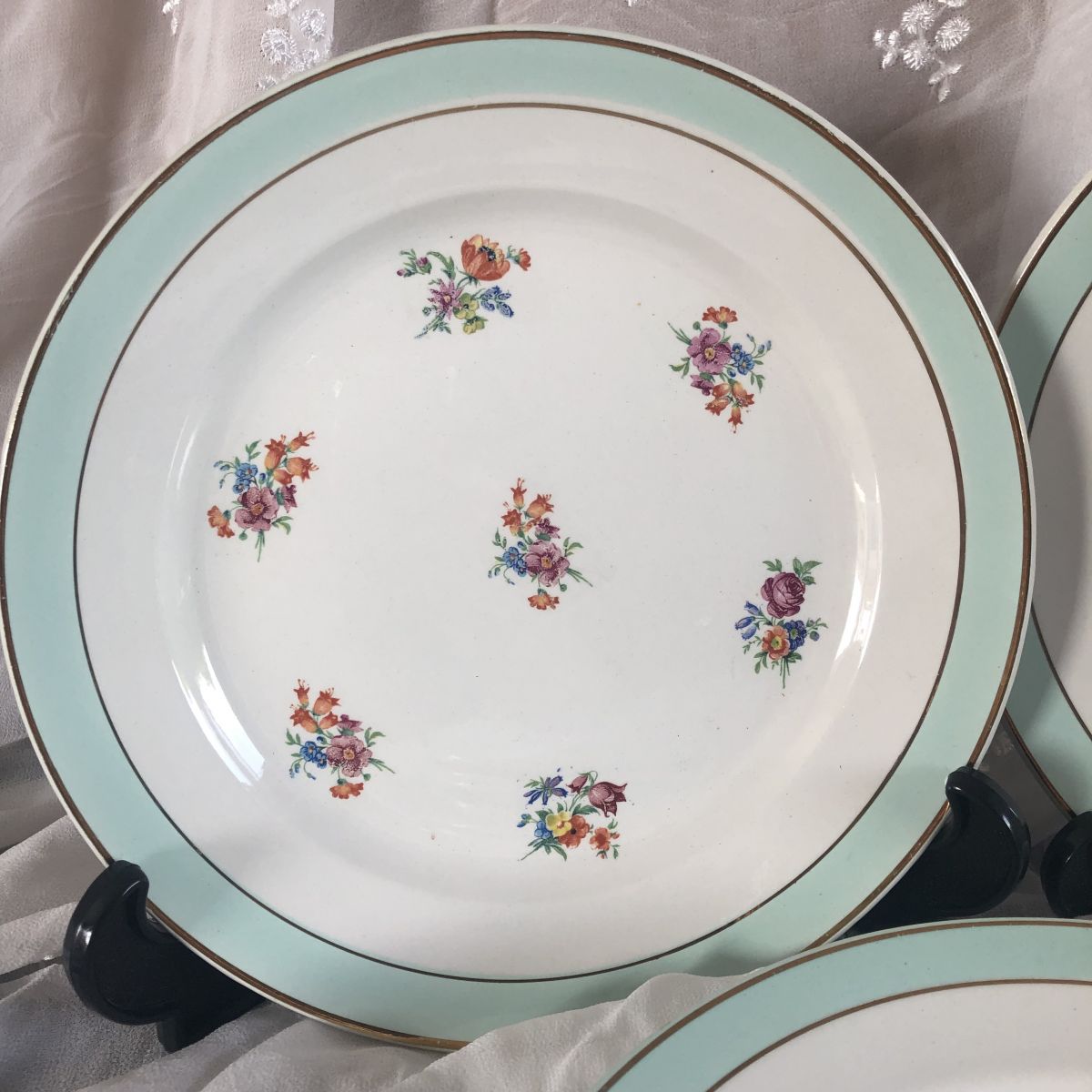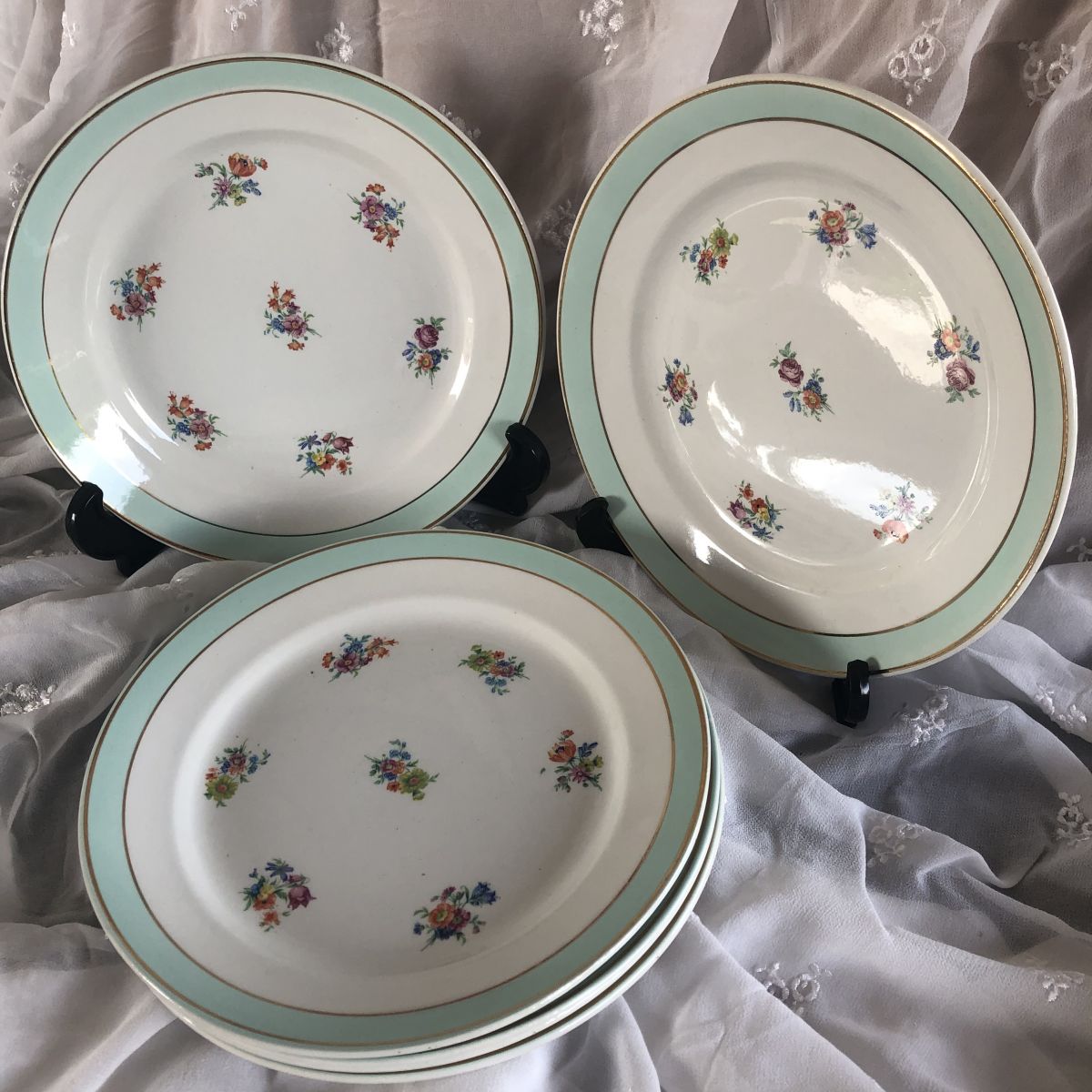 Ensemble de 6 assiettes plates KG Luneville. Décor petites fleurs surfons blanc avec bordure vert pâle et filet doré.