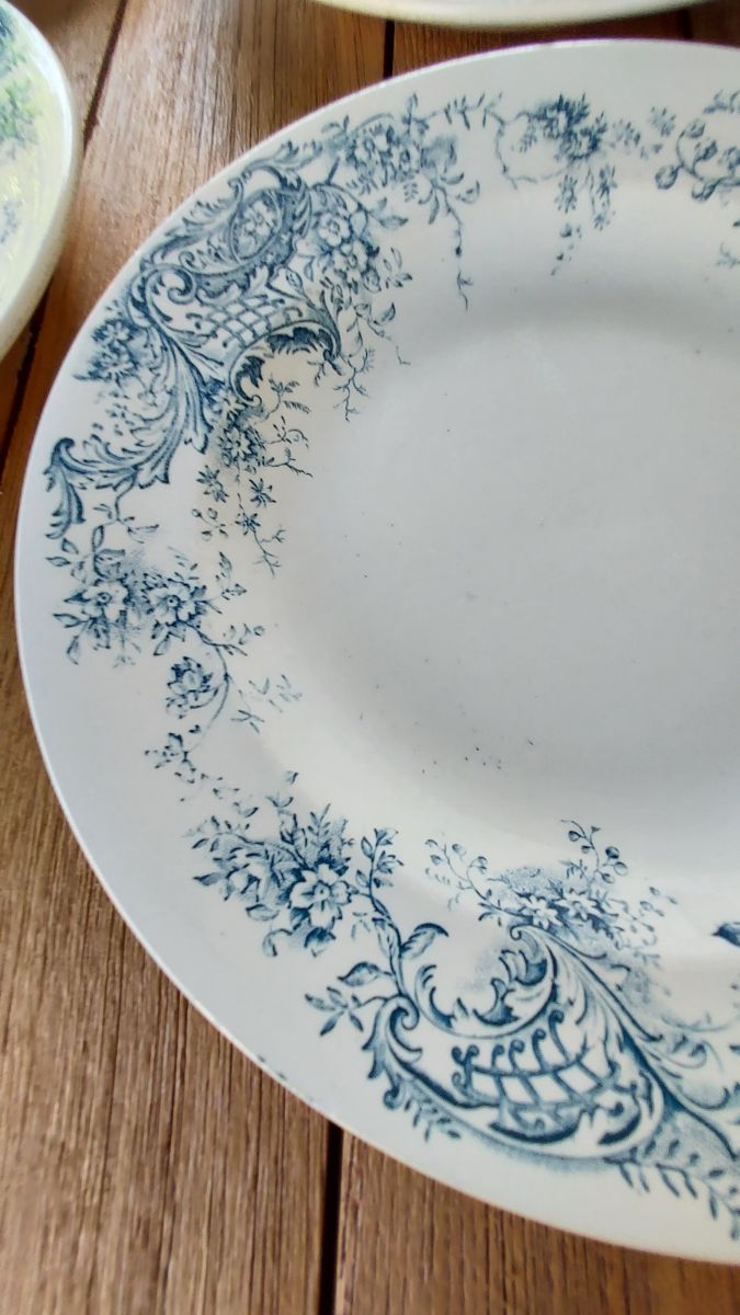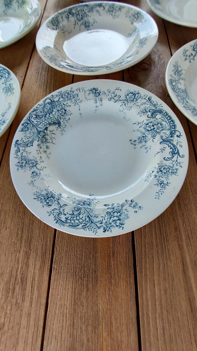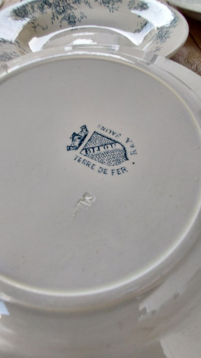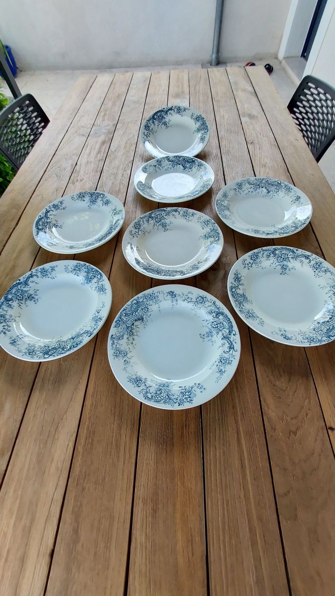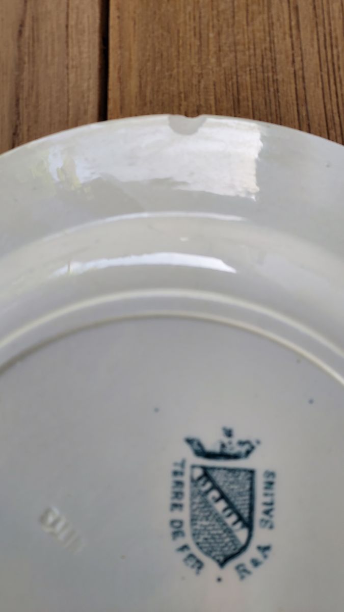 Ensemble de 8 assiettes creuses en faïence Terre de Fer R & A - Salins - modèle "Bijou". Une assiette a un éclat en dessous, sinon elles sont en bon état. Peuvent convenir en assiettes plates car peu profondes.