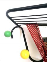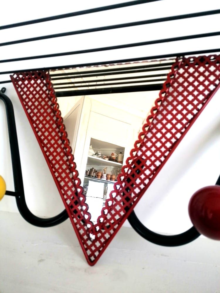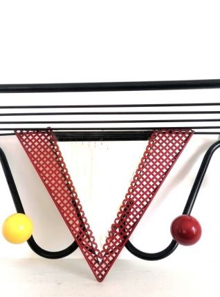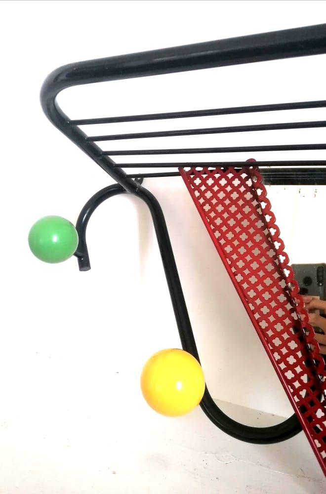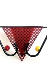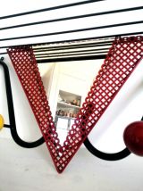 Porte-manteau murale à structure tubulaire, et empiècement triangulaire en tôle perforée au trèfle, dit "rigitulle", de couleur rouge, recevant un miroir triangulaire également (piqures à la glace). Porte-chapeau supérieur. 4 patères boules de couleurs rouge, vert et jaune.