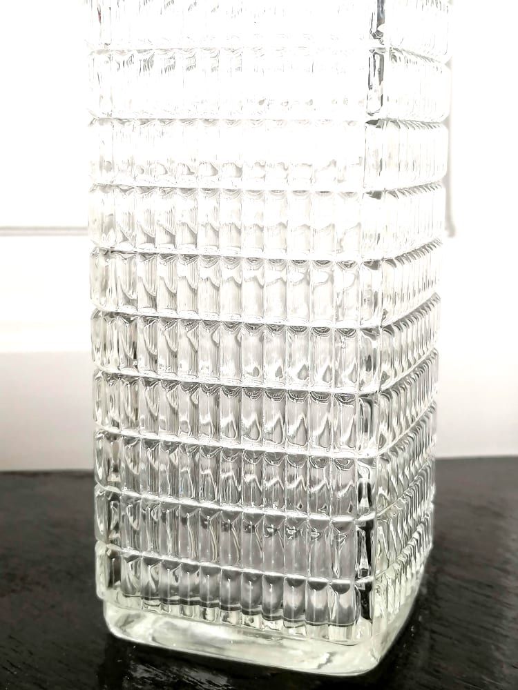 Corps à base carré et bouchon rond, en verre moulé taillé d'un maillage de motifs rectangulaires.