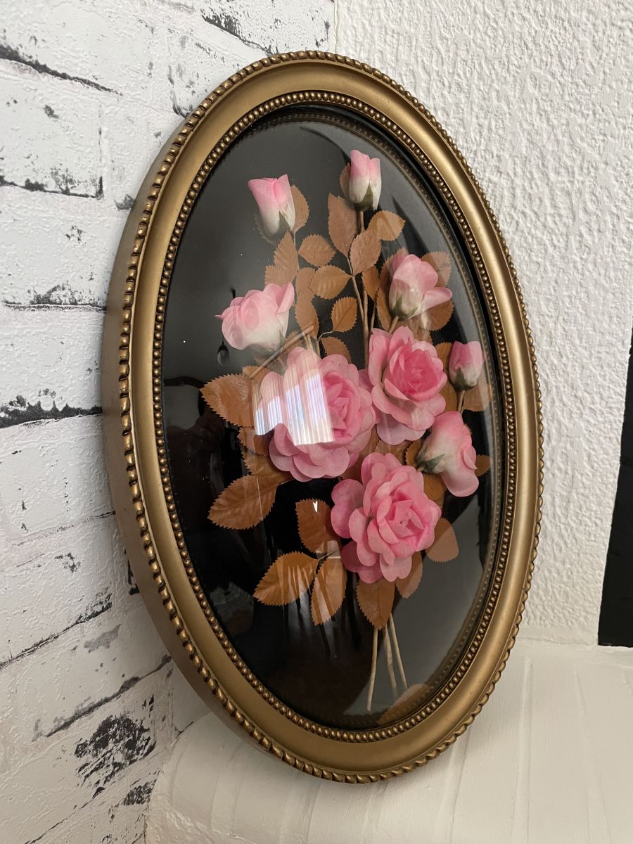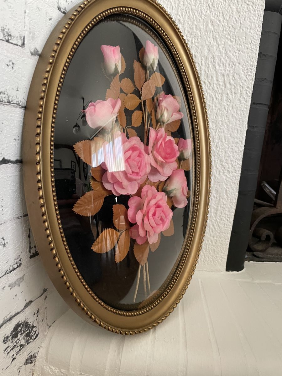 Très joli cadre doré avec de belles fleurs sous un verre bombé.