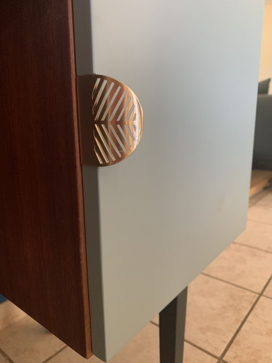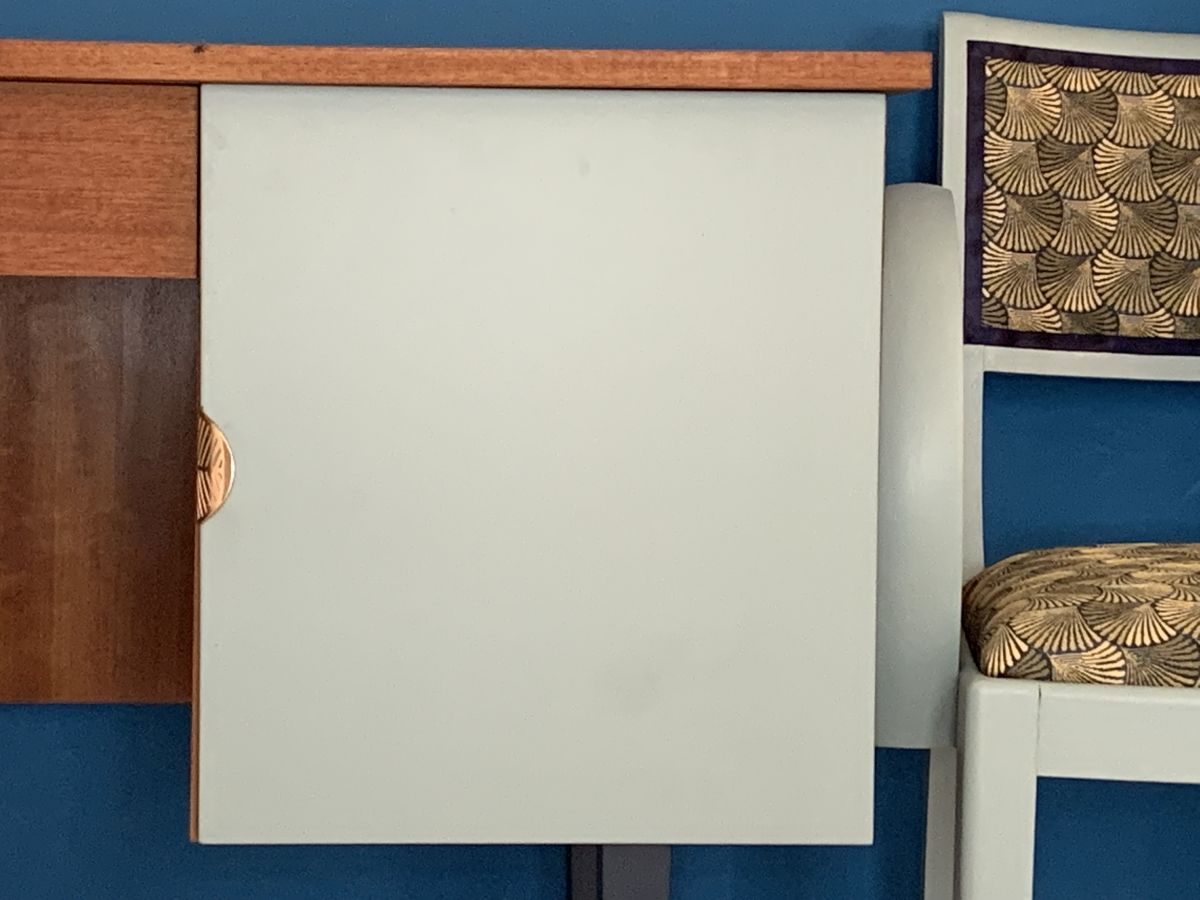 Ce bureau est magnifique et entièrement restauré par mes soins (je suis ébéniste) la finition huilée offre un aspect brut du teck très chaleureux au touché, les portes sont laqué au pistolet ce qui leur rend un aspect lisse et mat qui contraste avec l’effet brut du teck.