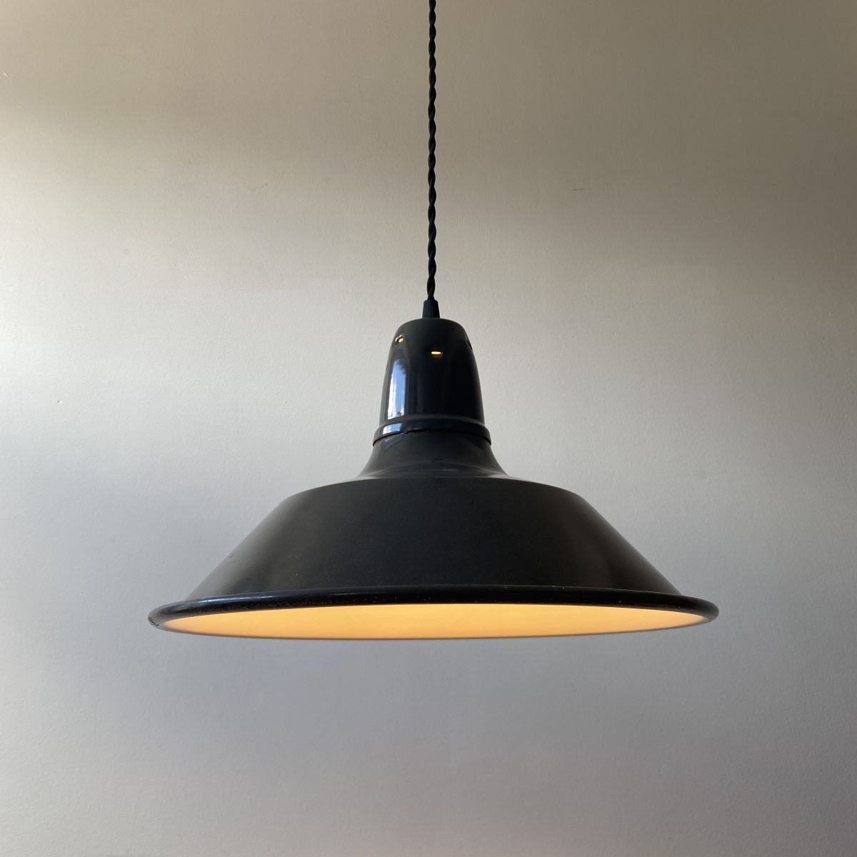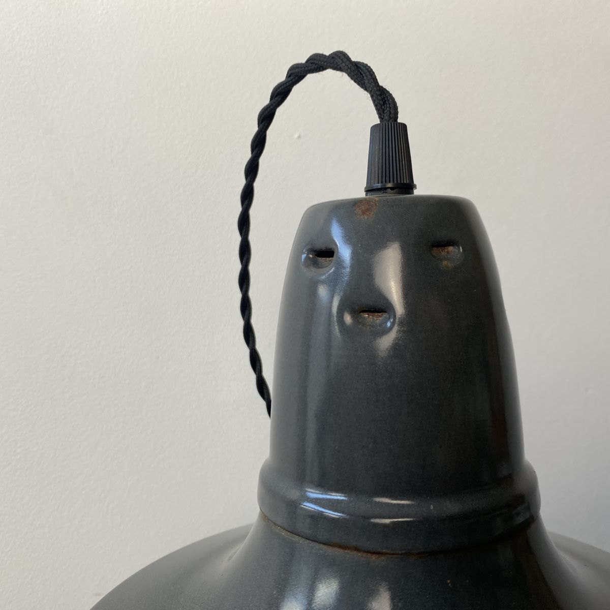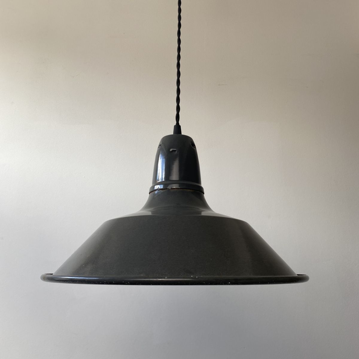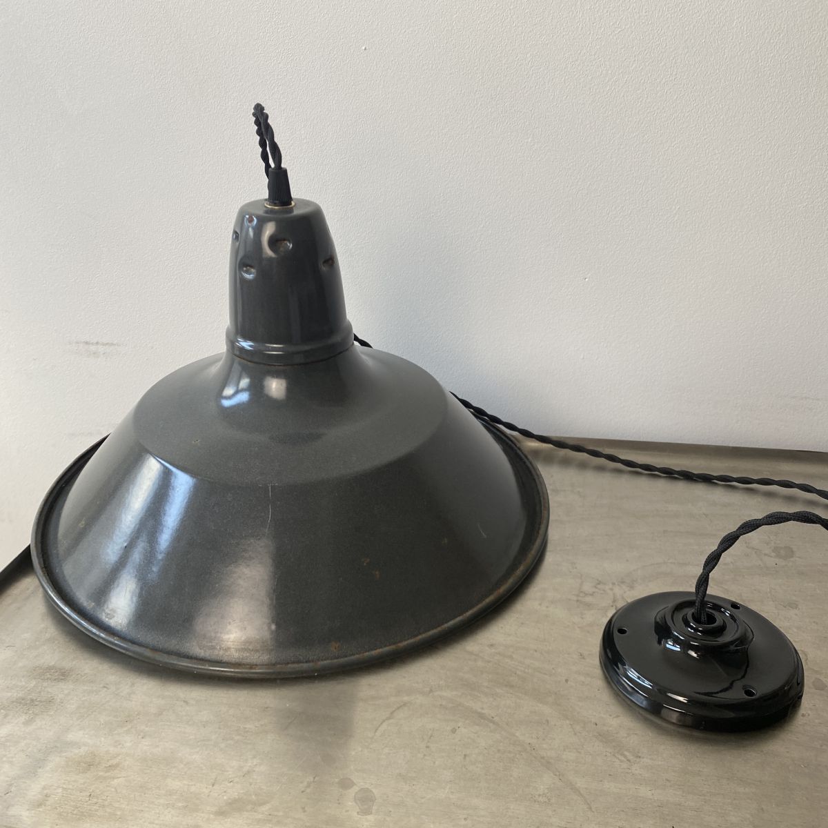 ANCIENNE SUSPENSION INDUSTRIELLE EMAILLÉE GRISE 35,5 cm