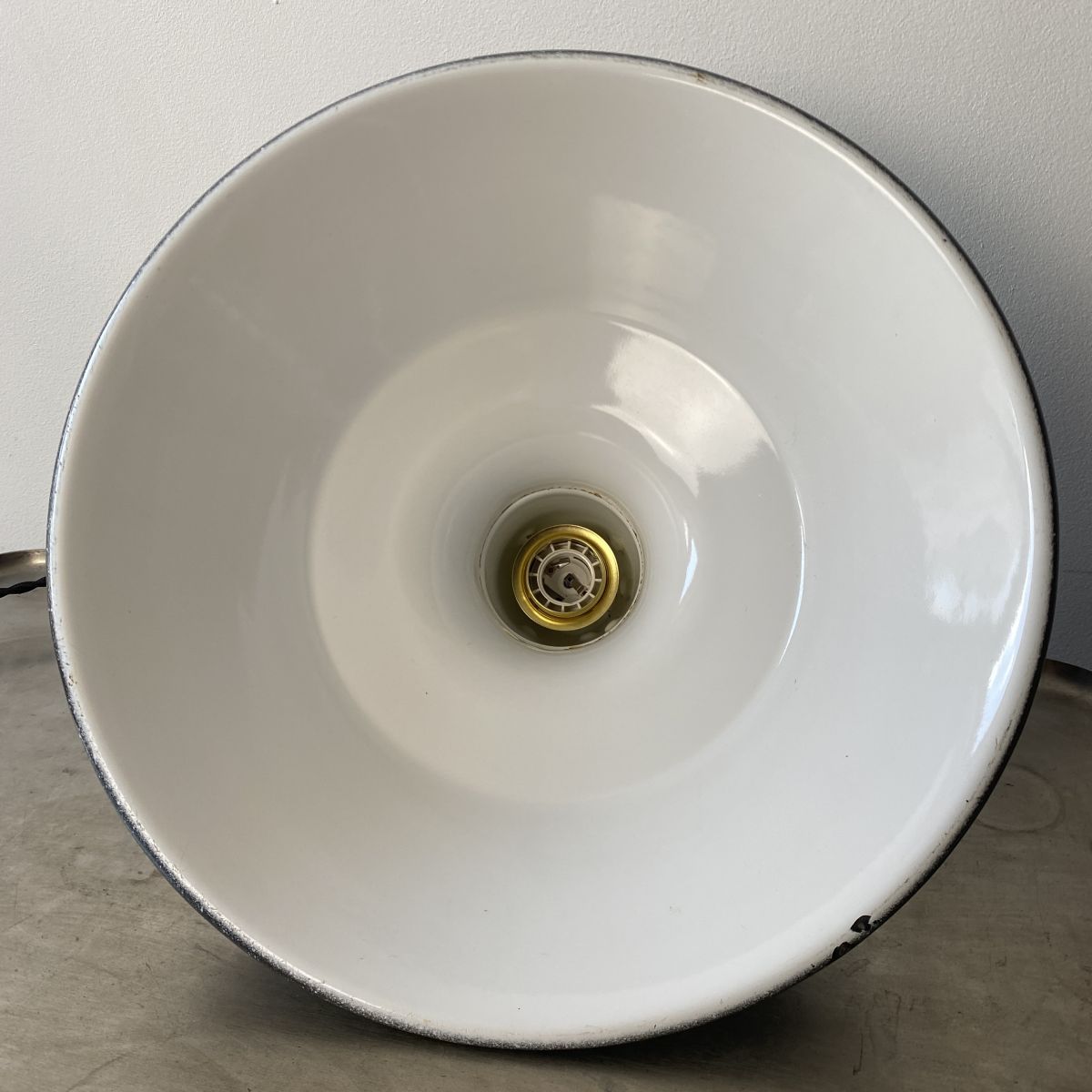 Ancienne suspensions industrielles en tôle émaillée grise. Années 1960. En très bel état malgré des traces de rouilles et sauts d’émail.