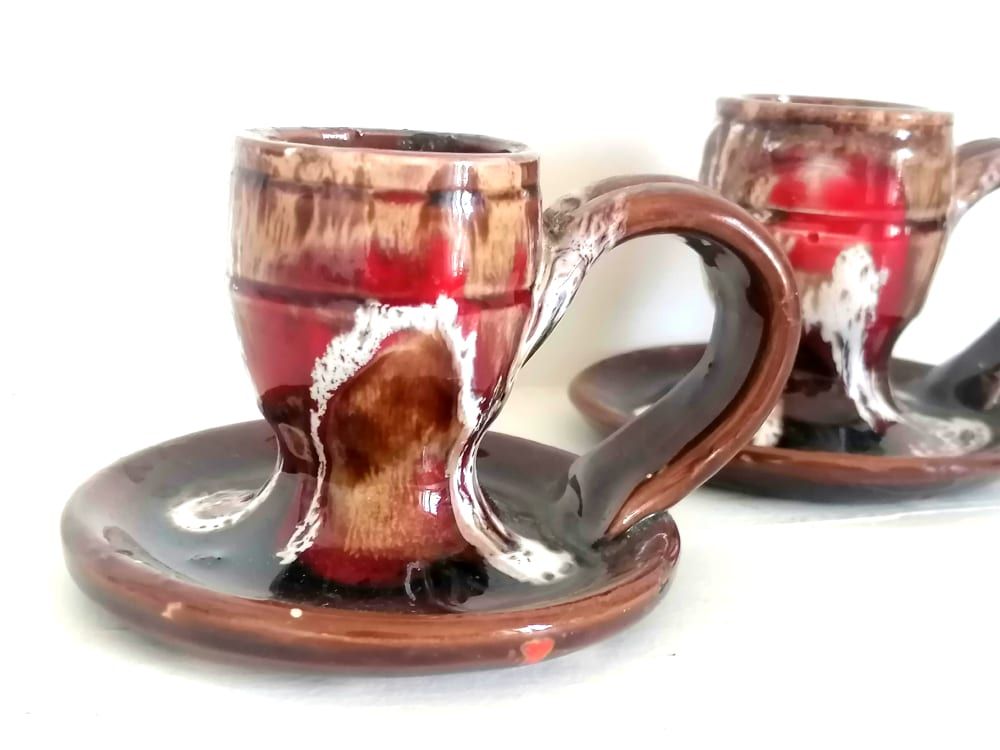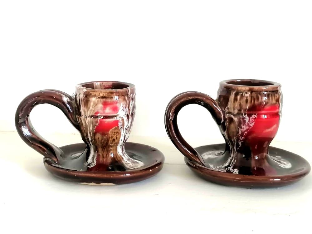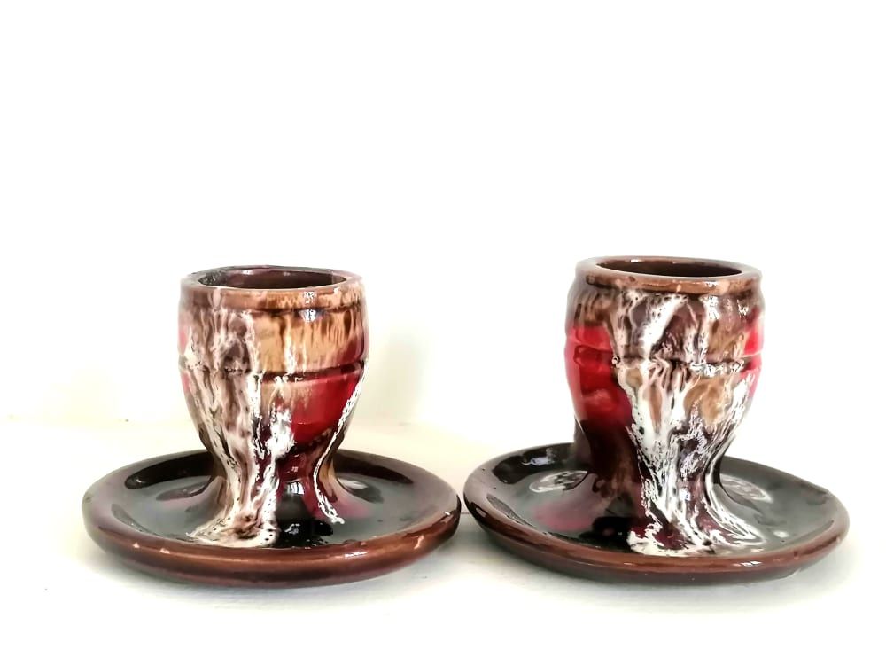 Paire de bougeoirs à mains en céramique émaillée dans le style de Vallauris. Travail des années 1960, émaillage épais sur fond brun à décor de coulures rouges et blanches.
