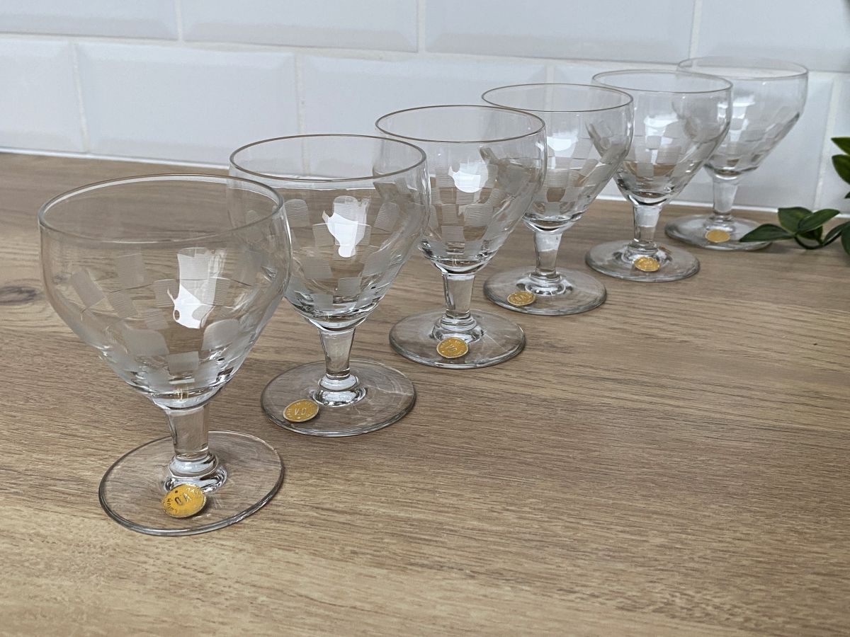 Set de 6 verres à vin gravés. Des verreries Doyen, made in Belgium. Modèle Humberto. Décor en damier. Bel état, l'un des verres a un défaut de fabrication, une impureté fondue dans le pied du verre. Contenance 6 cl. Diamètre du buvant 6 cm, diamètre du pied 5,5 cm. Hauteur 8,2 cm. Poids 450 g. Je possède 2 lots de 6 verres. Contactez moi pour un envoi groupé! V883-bis