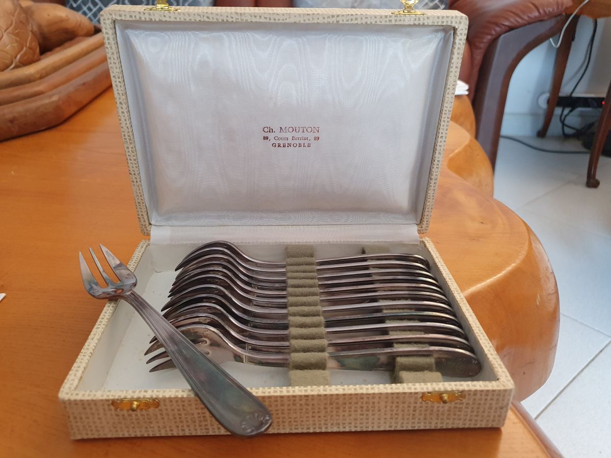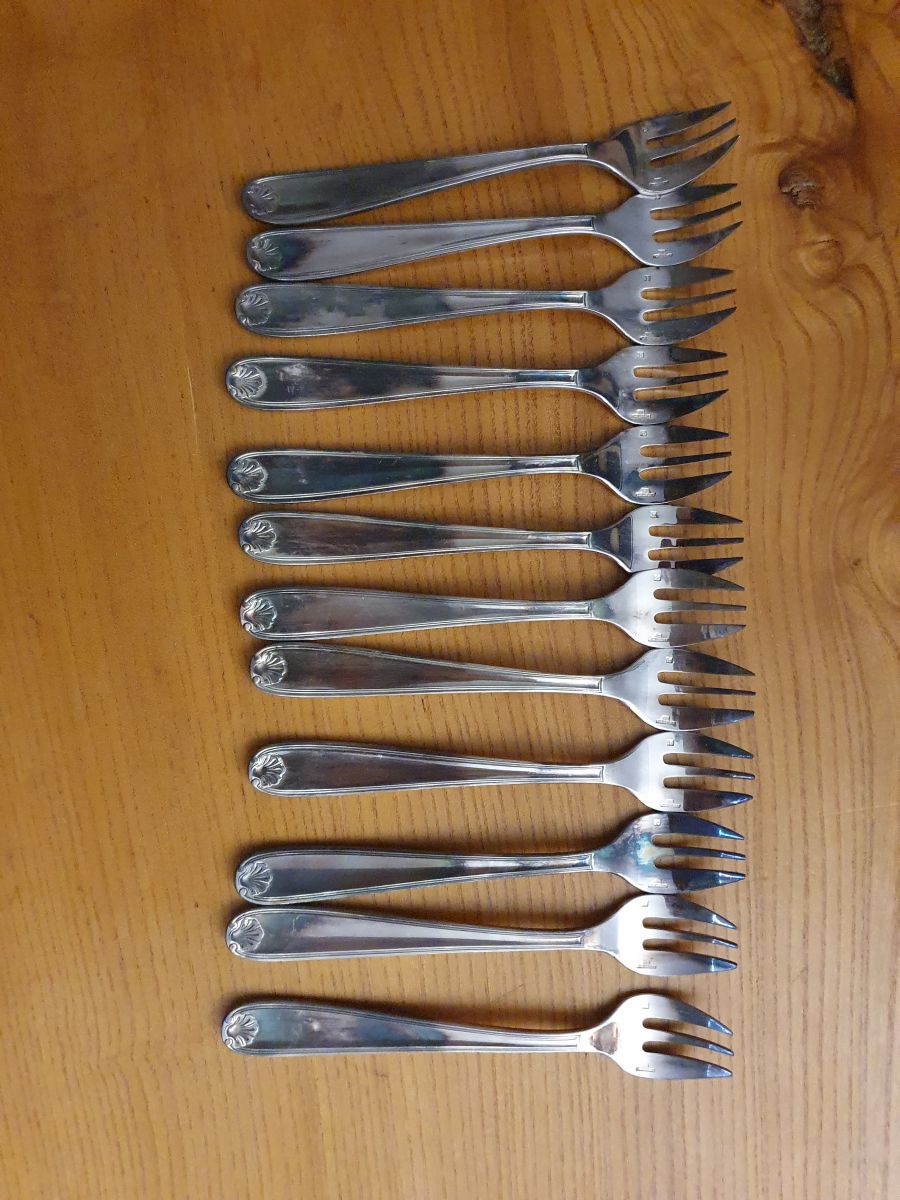 12 fourchettes à huitre Christofle modèle Marot métal argenté. Poincon Christofle , orfèvre Christofle et poincon métal argenté. Trés bon état. Achat année 1950 environ. 470g. Vendu avec la boite .