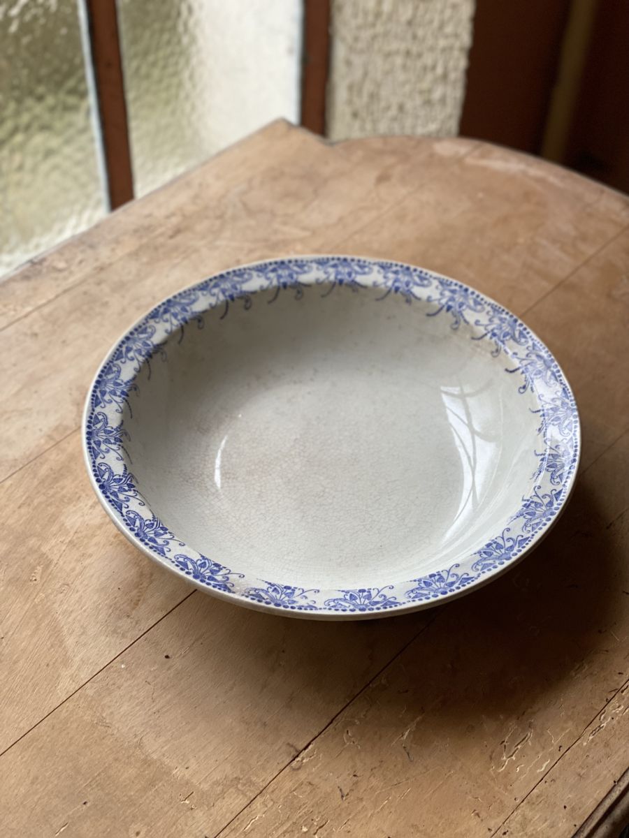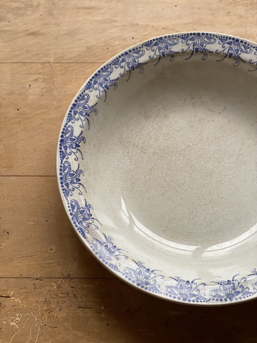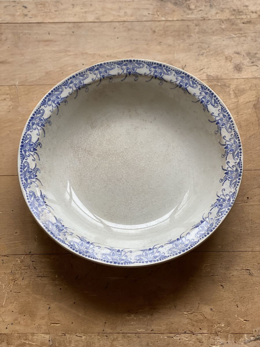 Une magnifique assiette creuse art nouveau en faïence d'origine France datant 19ème siècle, année 1920, à motif bleu perlé et de coloris ivoire.