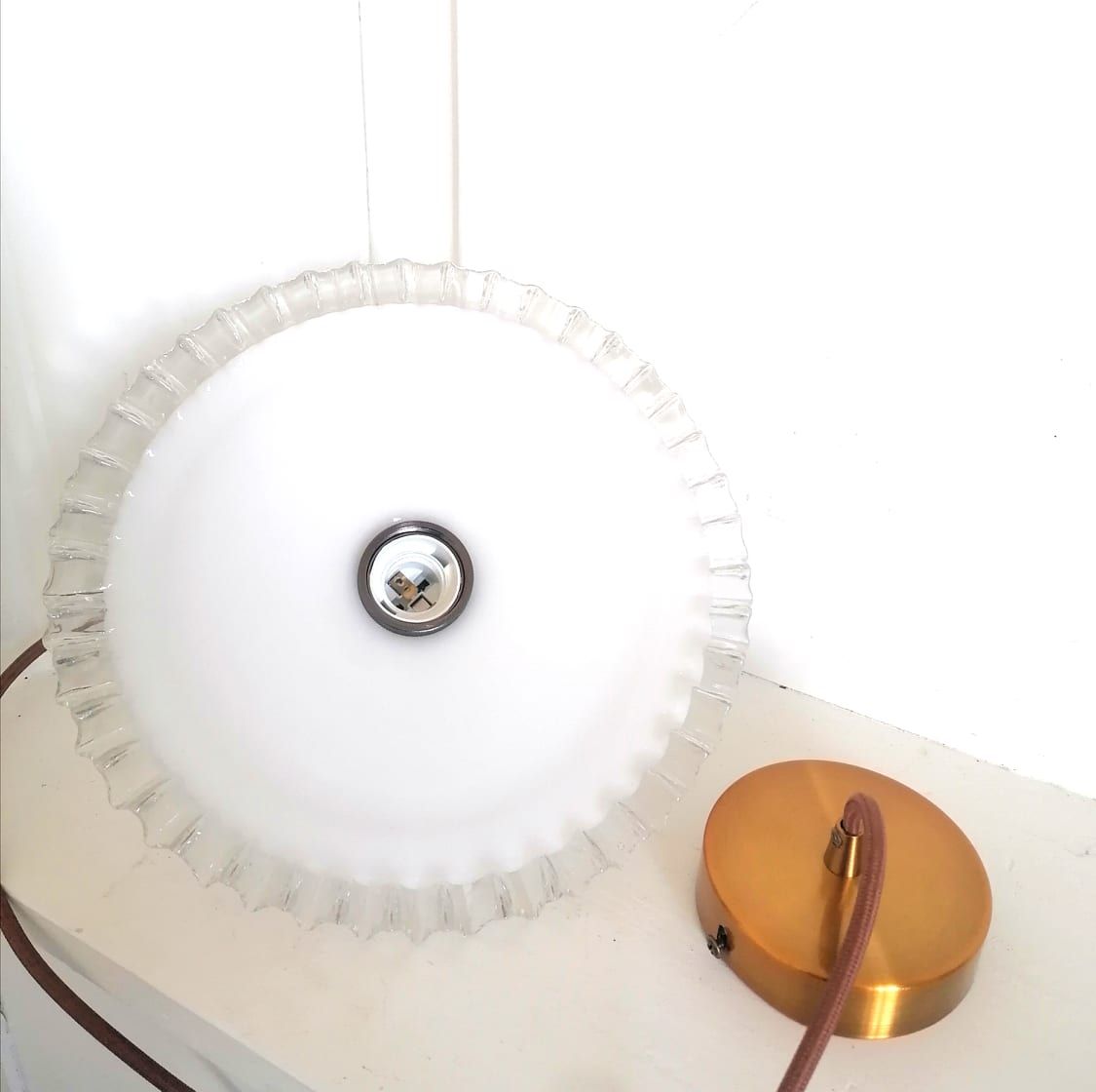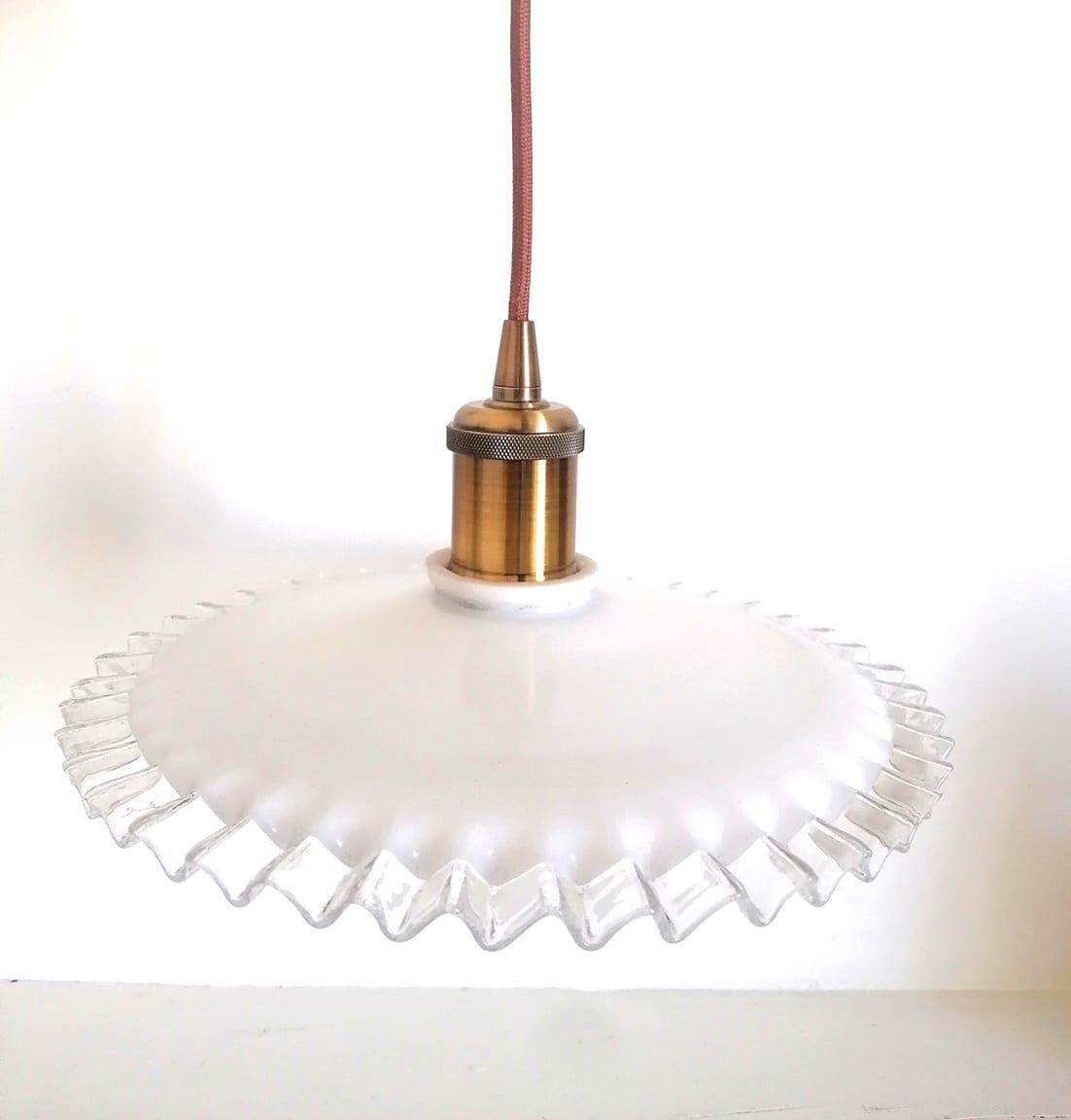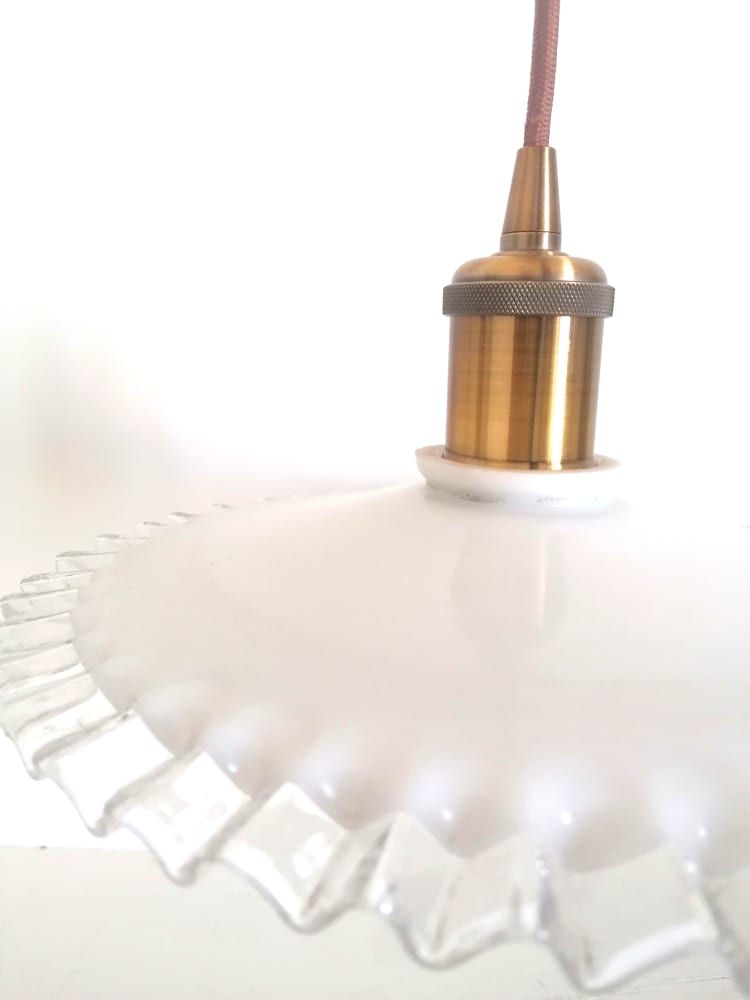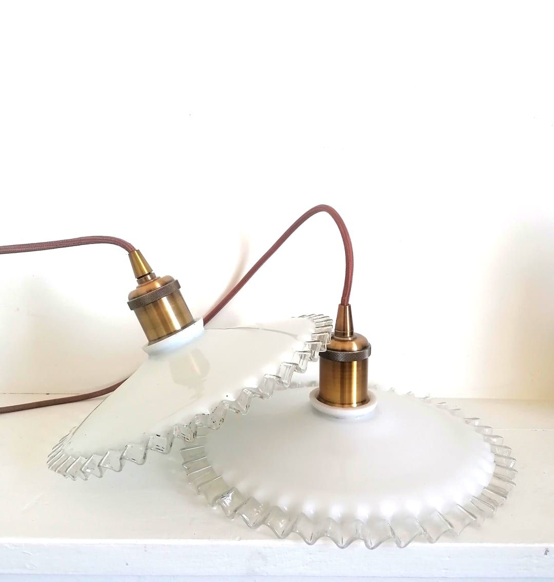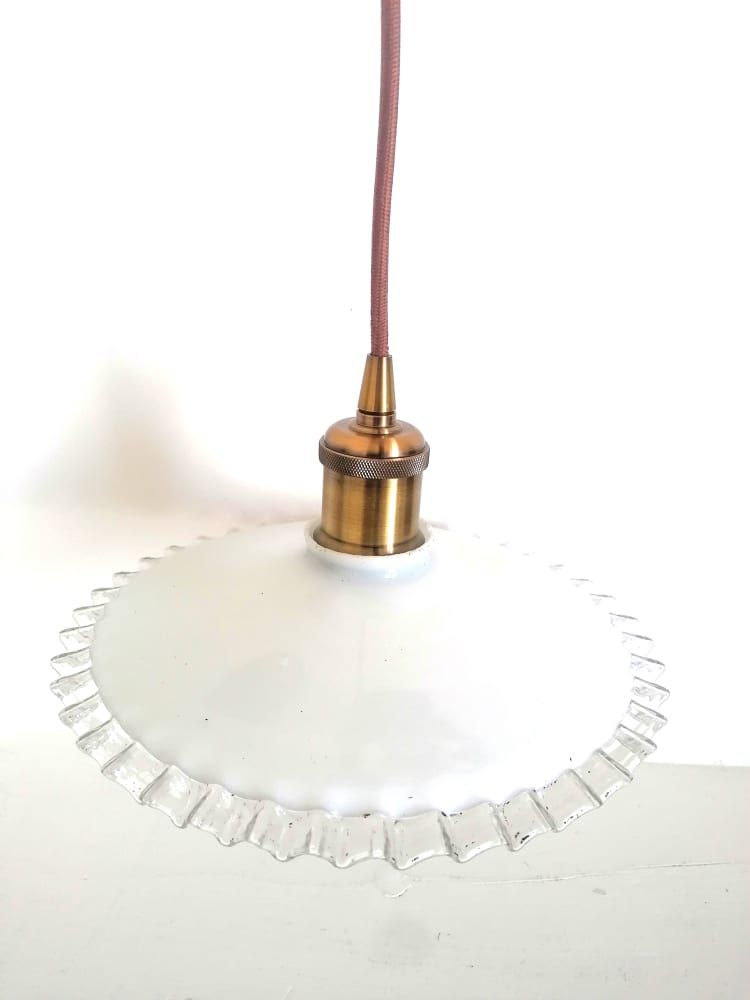 Paire de suspensions en opaline blanches vintages au bord dentelé, montées à l'électricité.