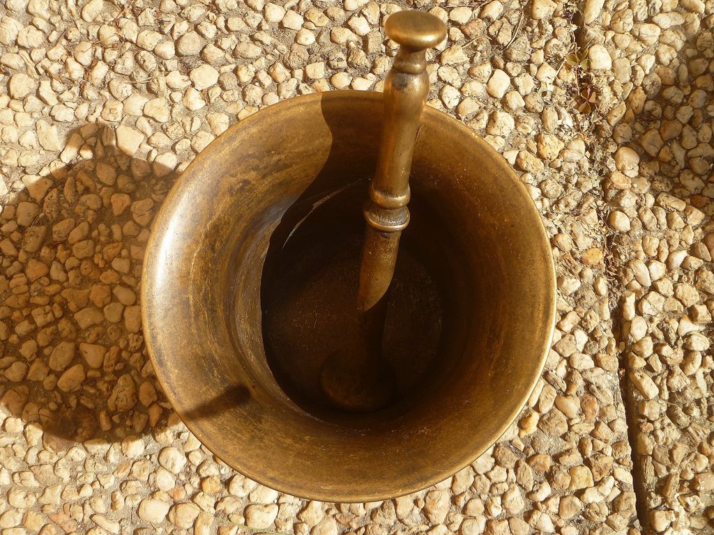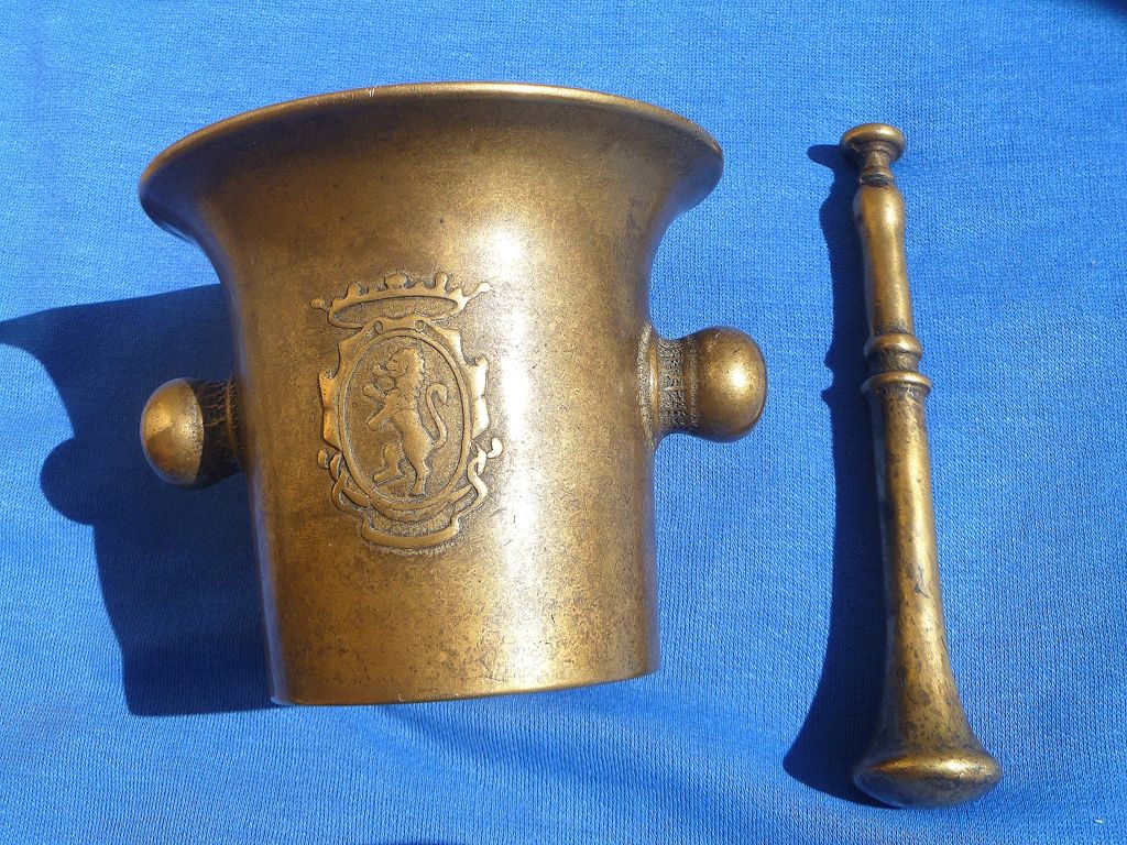 Beau mortier en bronze lourd avec à l'avant et à l'arrière un blason surmonté