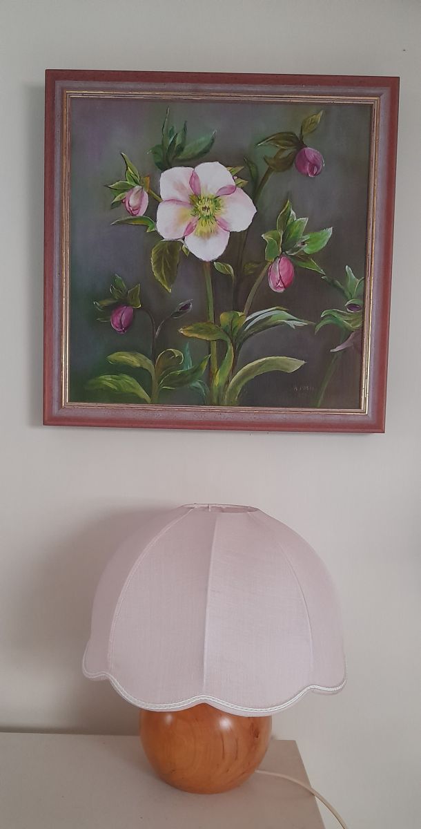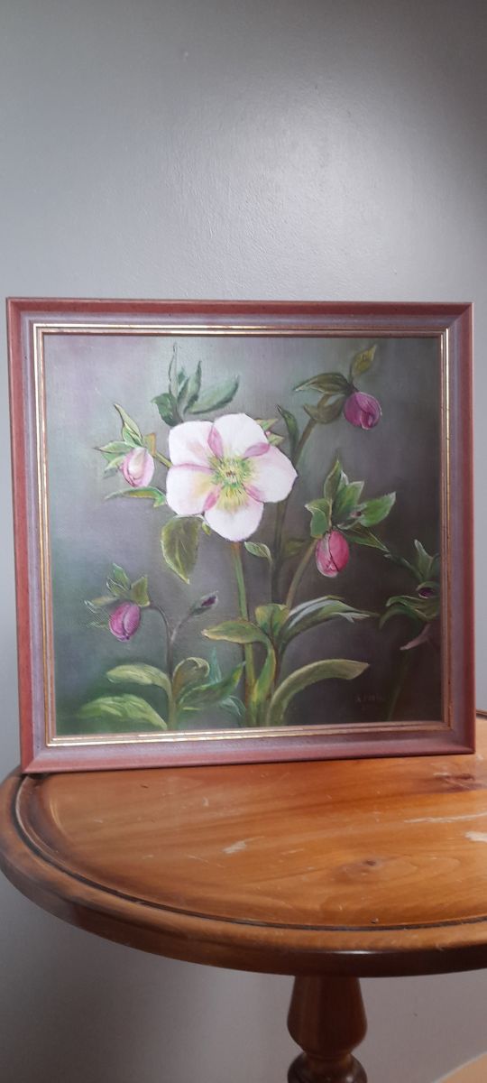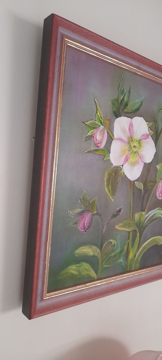 Tableau, peinture sur toile représentant des fleurs d'hellébores roses épanouies et des boutons prêts à éclater pour le plus grand plaisir de l'oeil avec des teintes de rose plus soutenu.