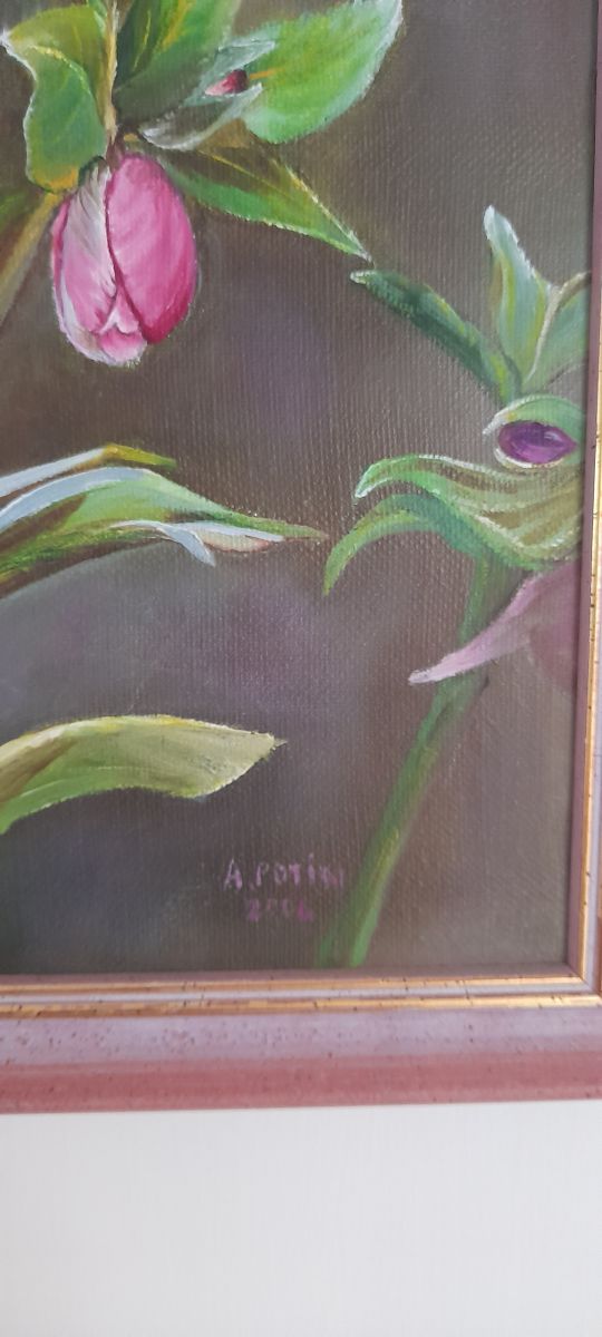 Le cadre bois est dans des tons cérusé rose pour rappeler la fleur, avec un joli liseré doré. Très bel état.
