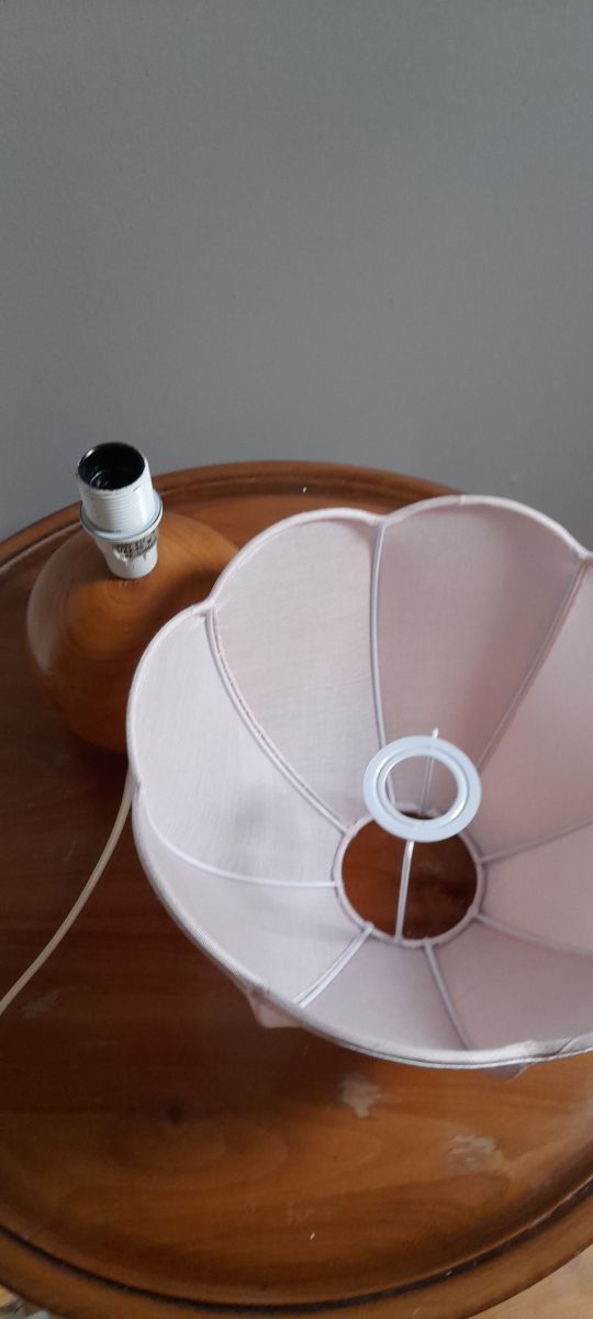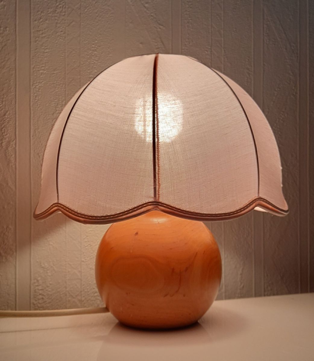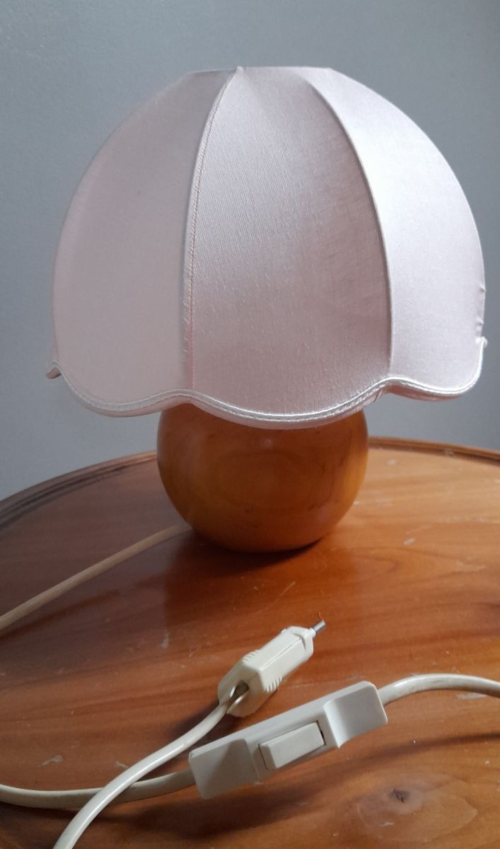 Petit pied de lampe tout rond en bois massif teinte clair, coiffé d'un abat-jour dôme en tissu couture rose clair qui donne un éclairage doux et tamisé.