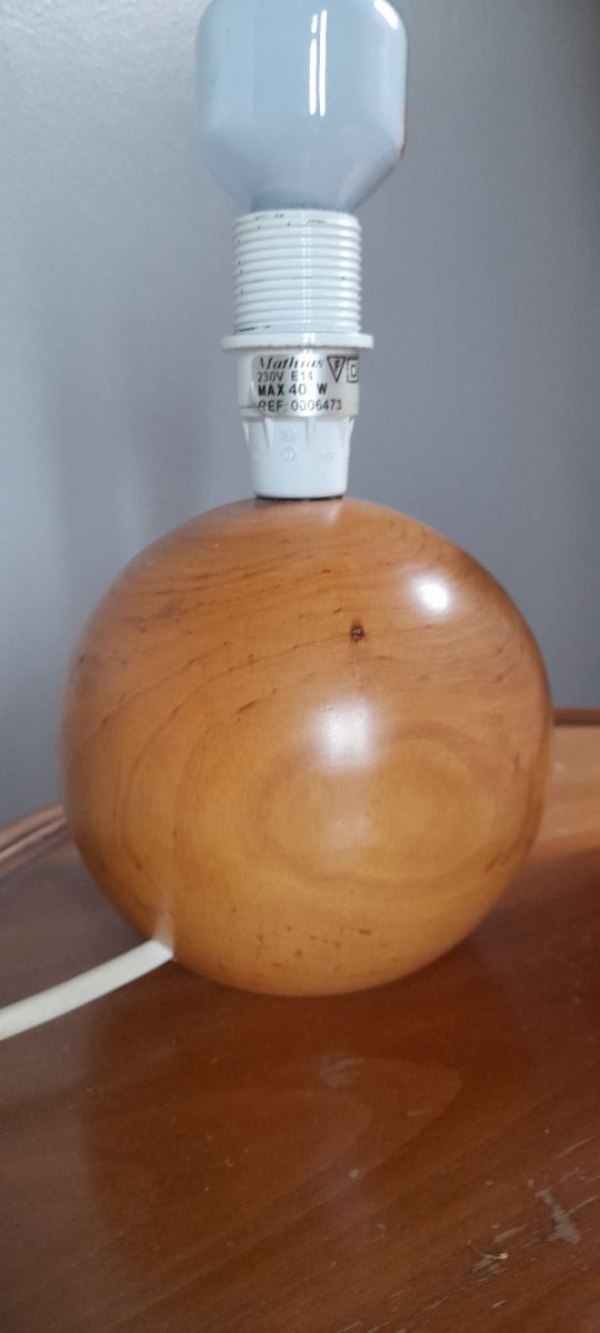 lampe à poser pied boule bois clair, abat jour dôme rose