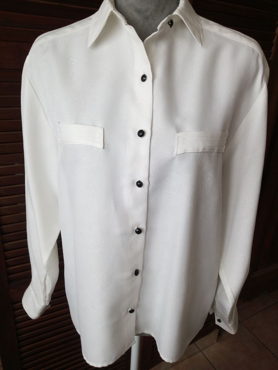 Chemisier élégant à petit col pointu couleur crème fermeture bouton noir à facettes confectionné par une professionnelle ( ma maman) dans un tissu de qualité des années 80 - fausse poche poitrine surpiquée - pli plat au dos - comme neuf