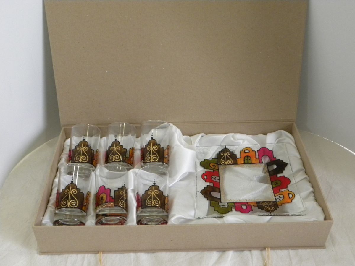 Verres à thé marocain peints à la main, chaque verre est décoré d'un motif arabesque inspiré de Sidi de Bousaid ( petit village du nord inscrit au patrimoine mondial depuis 1979). Service à thé composé de 6 verres et 6 et d'un plateau. Ils sont utiles pour servir votre boisson ou votre thé à la menthe chaud. Les dessins sont 100% peints à la main et aucun outil n'est utilisé. Le service à thé est réalisé à la main par une artisane tunisienne et designer spécialisée dans la peinture sur verre. La plupart des créations sont essentiellement inspirées de l'arabesque, de sidi bousaid (petit village du nord de la tunisie inscrit au patrimoine mondial depuis 1979) de l'art berbère et de l'environnement désertique du sud de la tunisie comme la main de fatma, le palmier ou les lettres arabes. Ce service à thé vous offre tout ce dont vous avez besoin pour créer des souvenirs intemporels. Capacité: 16 cl. L'expédition est effectuée via DHL.