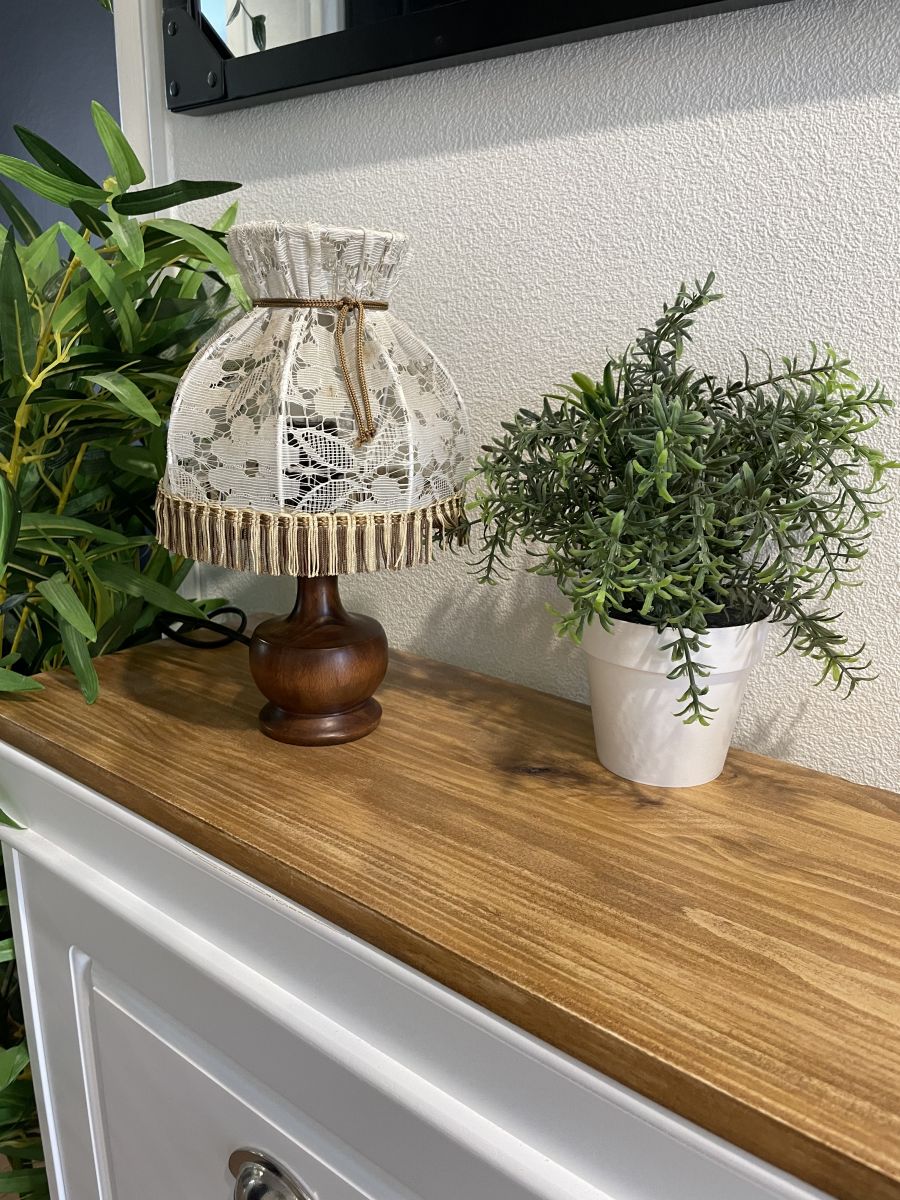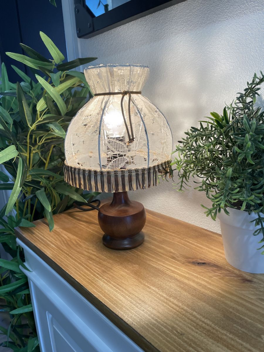 Jolie lampe à poser vintage avec son pied en bois tourné et son abat jour en délicate dentelle dans les tons écrus.