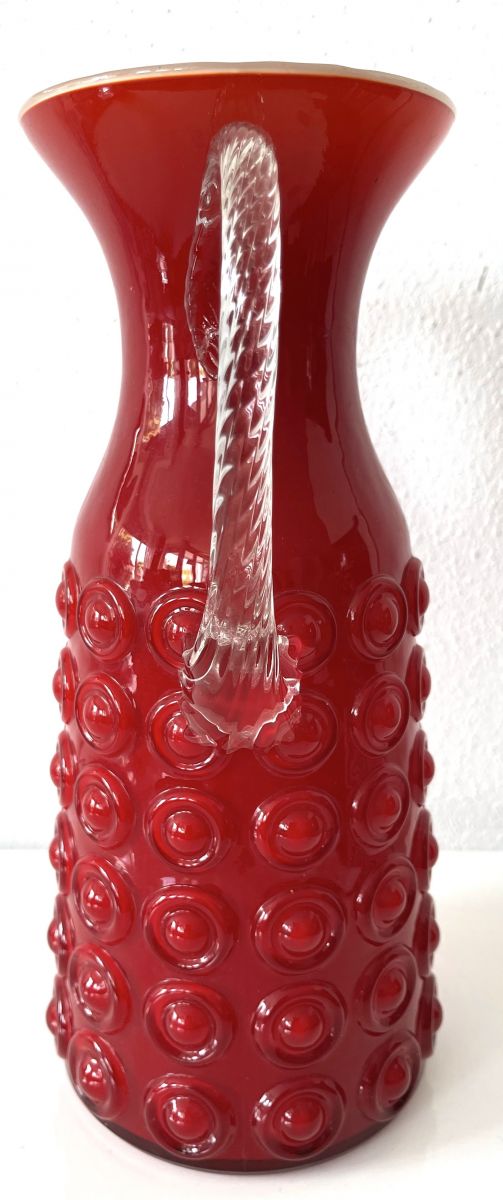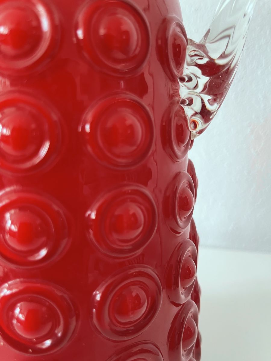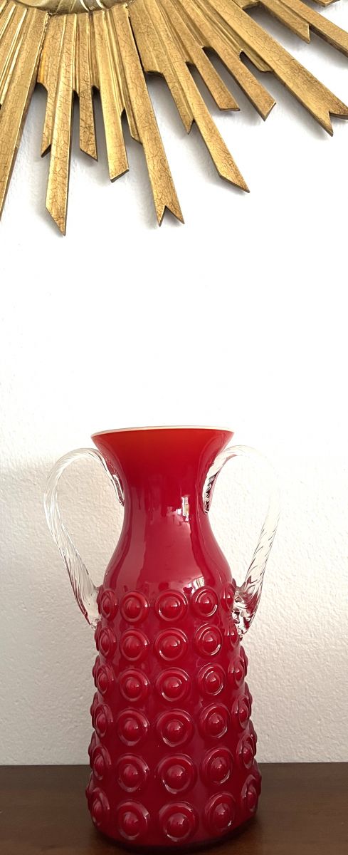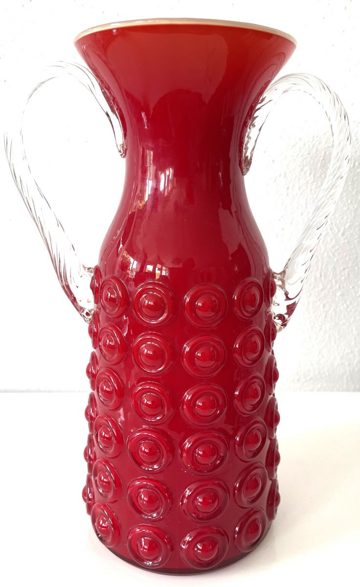 Ancien Vase à anses italien en verre de Murano. En excellent état et trés lumineux. Le corps du vase est en verre opaque rouge écarlate. Les anses torsadées sont en verre translucide. Décoration de bulles de verres sur les 3/4 du vase. Aucun manque ni rayure.