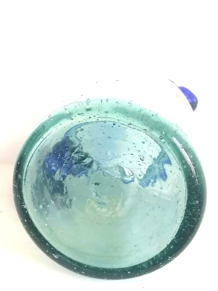 Carafe ou pichet en verre bullé style Biot. Modèle dans une nuance de bleu, verre épais et irrégulier.