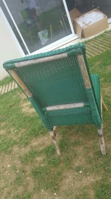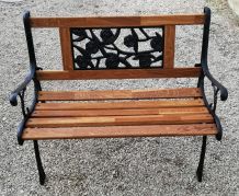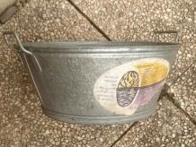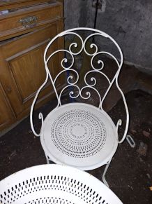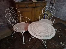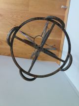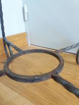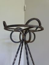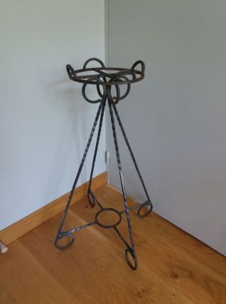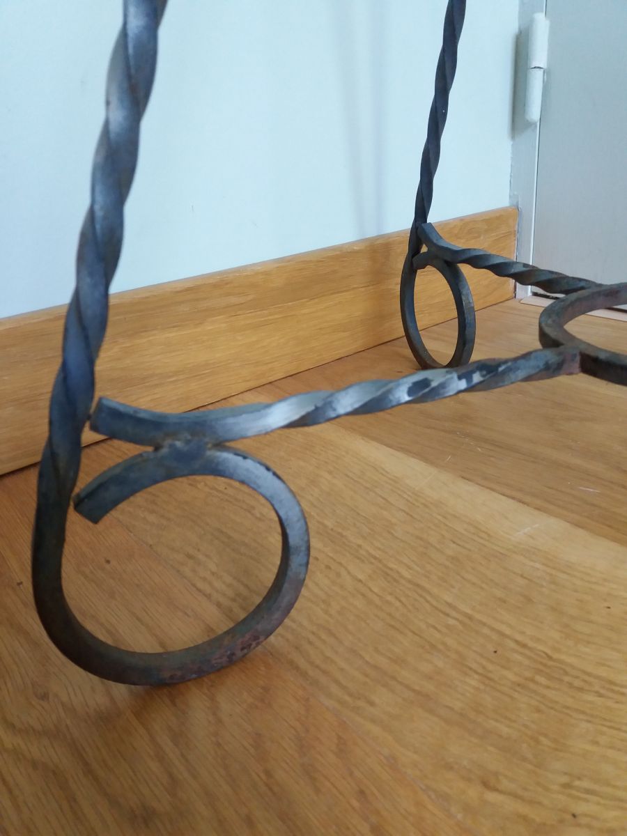Joli porte-plantes en fer forgé torsadé montrant un beau travail de ferronnerie artisanale. Comme il est muni d'une « plateforme » (en fer forgé elle aussi) et non un anneau dans lequel on encastre un pot, on peut y poser des pots de différentes tailles et on peut aussi imaginer s'en servir pour y poser une lampe. Il date probablement des années 70, peut-être avant. Il comporte deux emplacements, l'un plutôt grand en haut et celui du bas pour y poser un pot plus petit ou moins haut (car il faut le faire passer entre les montants). Comme il est relativement haut, il est idéal pour mettre en valeur une plante retombante. Il est en bon état structurel, solide, pas de soudure cassée mais ne cache pas son âge : un léger balancement à vide, un peu de corrosion superficielle et la laque noire dont il était probablement recouvert les premières années est absente... Pour ma part, je le préfère comme ça, avec la patine du temps, mais on peut aussi le re-laquer ou lui donner un aspect métal brut gris acier en le passant à la laine de fer. Il mesure 74, 5 cm de hauteur totale, la « plateforme » du haut est à 71 cm de hauteur et mesure 24, 5 cm de diamètre, celle du bas est à 9 cm de hauteur. L'empiètement est un carré de 36 cm de côté environ. Il pèse environ 4 kg.