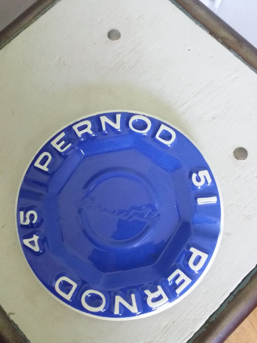 Joli cendrier de bar en céramique aux couleurs de la célèbre boisson de la marque Pernod fils. A l'arrière une estampille indique qu'il a été fabriqué par MDL qui est, d'après mes recherches, la manufacture st Amand moulin des loups connue surtout pour sa vaisselle en céramique. Ce qui est intéressant avec ce cendrier, c'est qu'on peut le dater précisément entre 1951 et 1954. En effet, l'apéritif Pernod 51 (51° d'alcool) a été créé en 1951 pour fêter l'année de libération des boissons alcoolisées, car depuis 1938 le degrés d'alcool maximal autorisé était de 45° (d'où la création du Pernod 45 quelques années auparavant). Or en 1954, devant la confusion entre les deux produits, le Pernod 51 a été rebaptisé Ricard 51. Ce cendrier avec un marquage évoquant les deux apéritifs du même nom mais avec deux degrés d'alcool différents a donc été fabriqué entre 1951 et 1954 ! Il est en bel état, pas de fêlure, pas de manque sur les marquage en relief, une laque encore bien présente, un bleu encore bien vif, mais ne cache pas son âge : une petite tache dans le fond du cendrier, un petit éclat sur le bord en sous-face ainsi que quelques taches et traces d'usure. Il mesure 15 cm de diamètre, 2 cm de hauteur et pèse un peu plus de 200 g