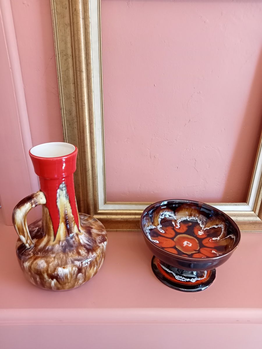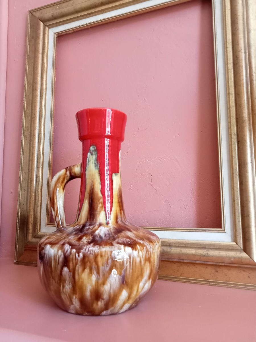 Très jolie vase/pichet multicolore dont un rouge éclatant, des années 70 au design Vallauris, signé par l'artiste Baudin dans un parfait etat.