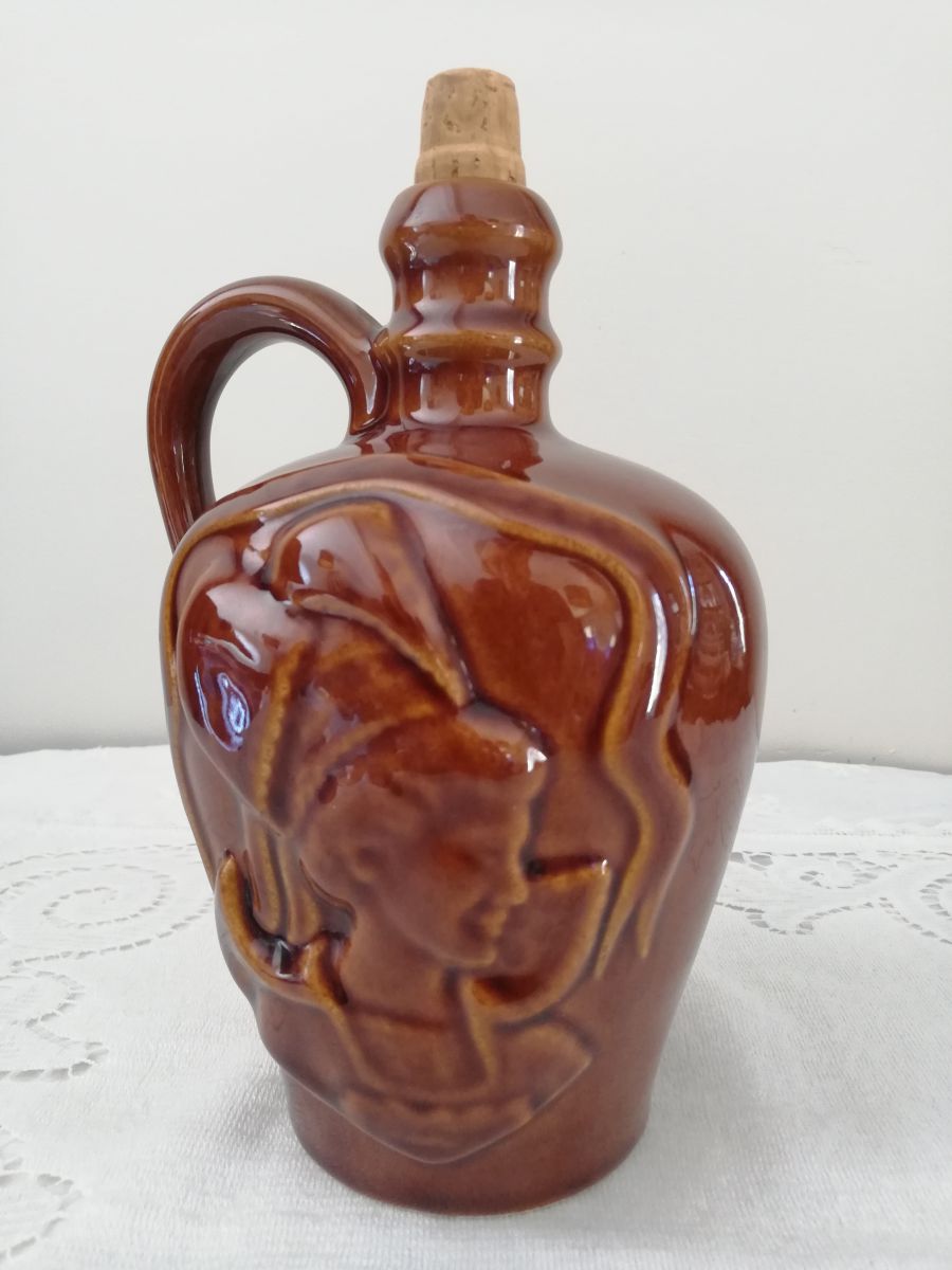 Ancienne bouteille de chouchen en céramique à décor de bretonne et breton en costume. Pas de défaut. Le bouchon n'est pas celui d'origine. Dimensions: h 19.5 cm, diamètre fond 7, 5 cm, poids 630 grs.