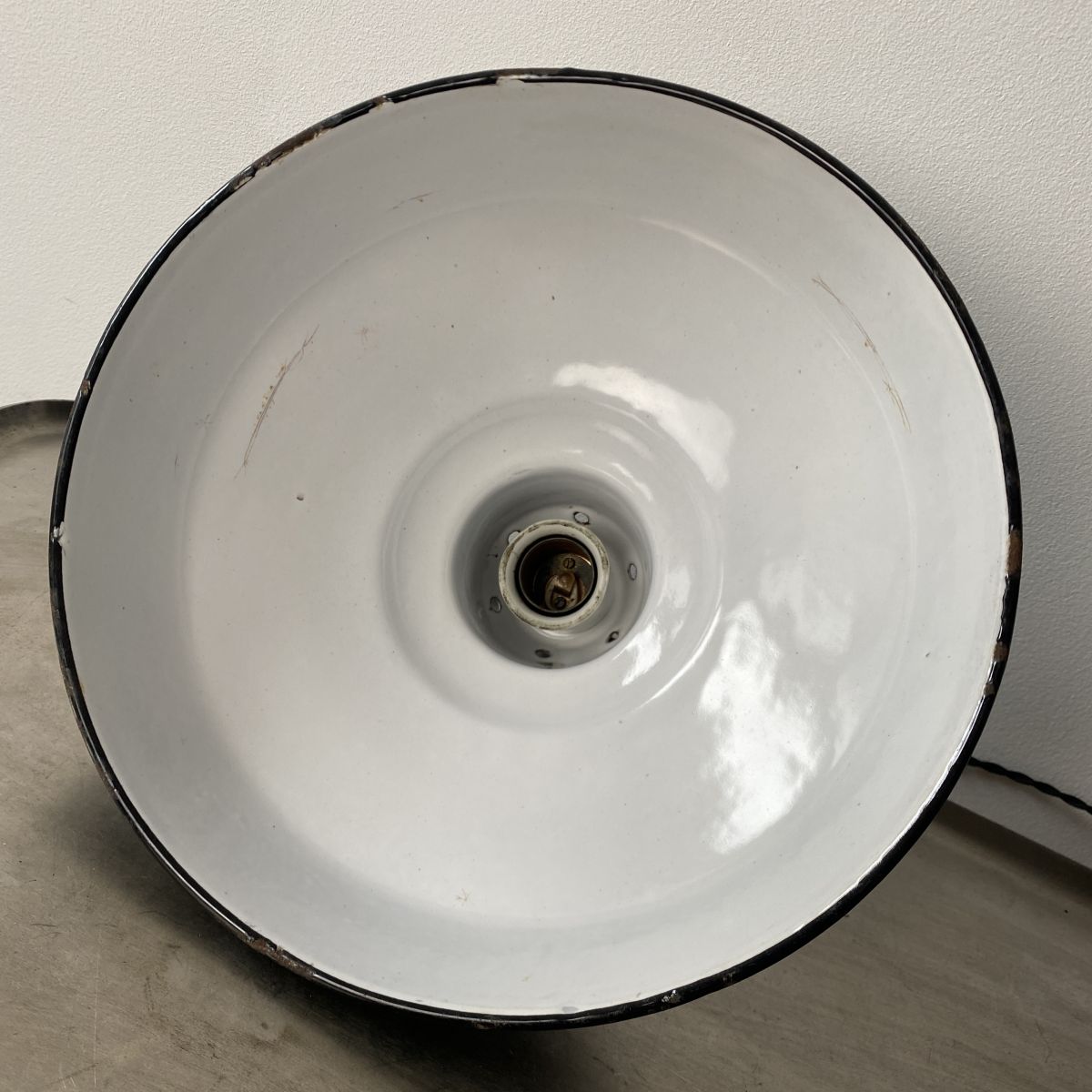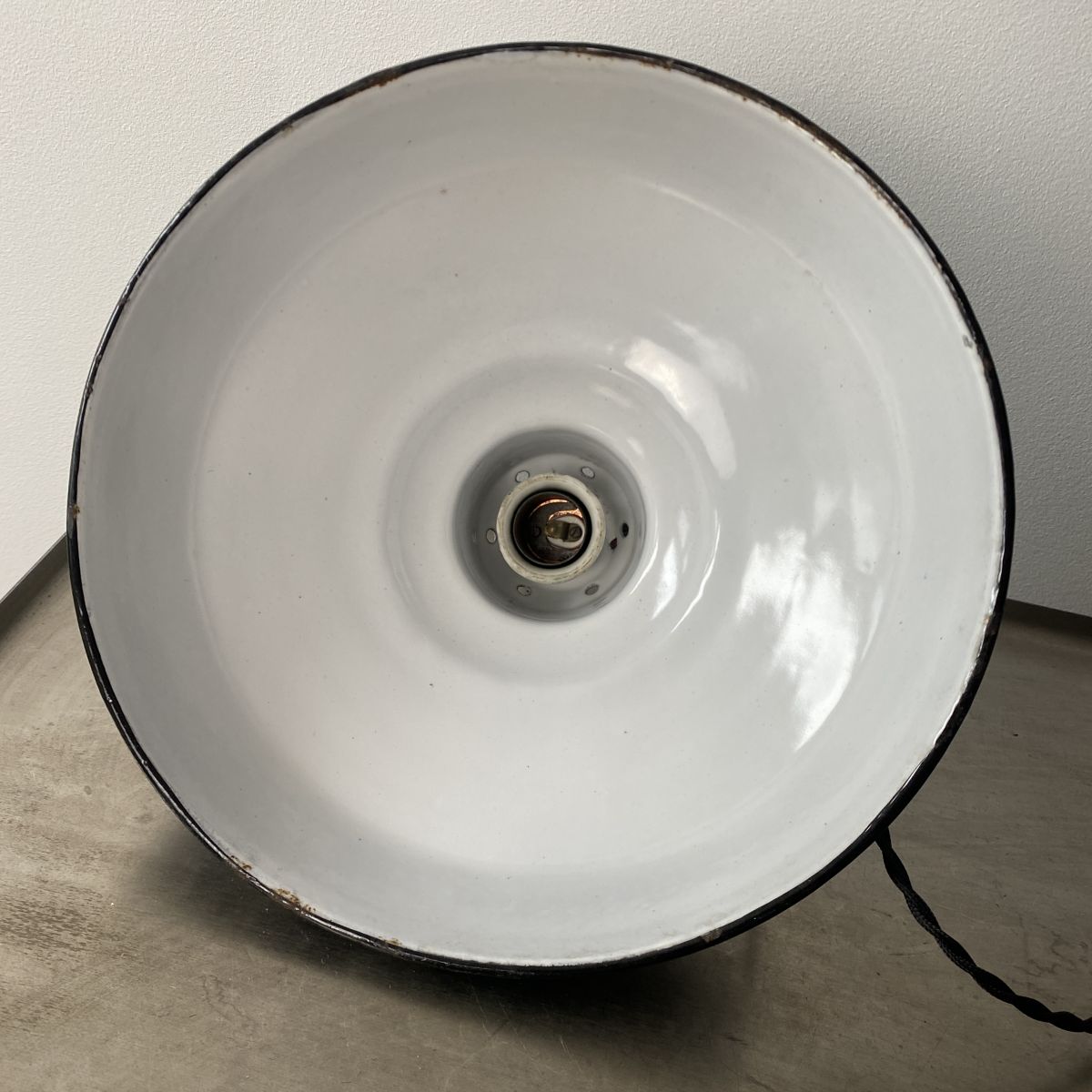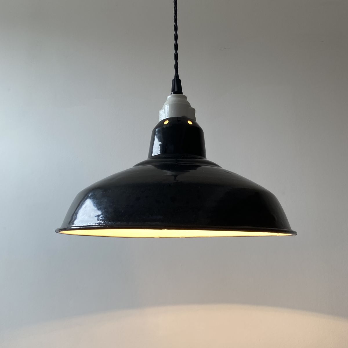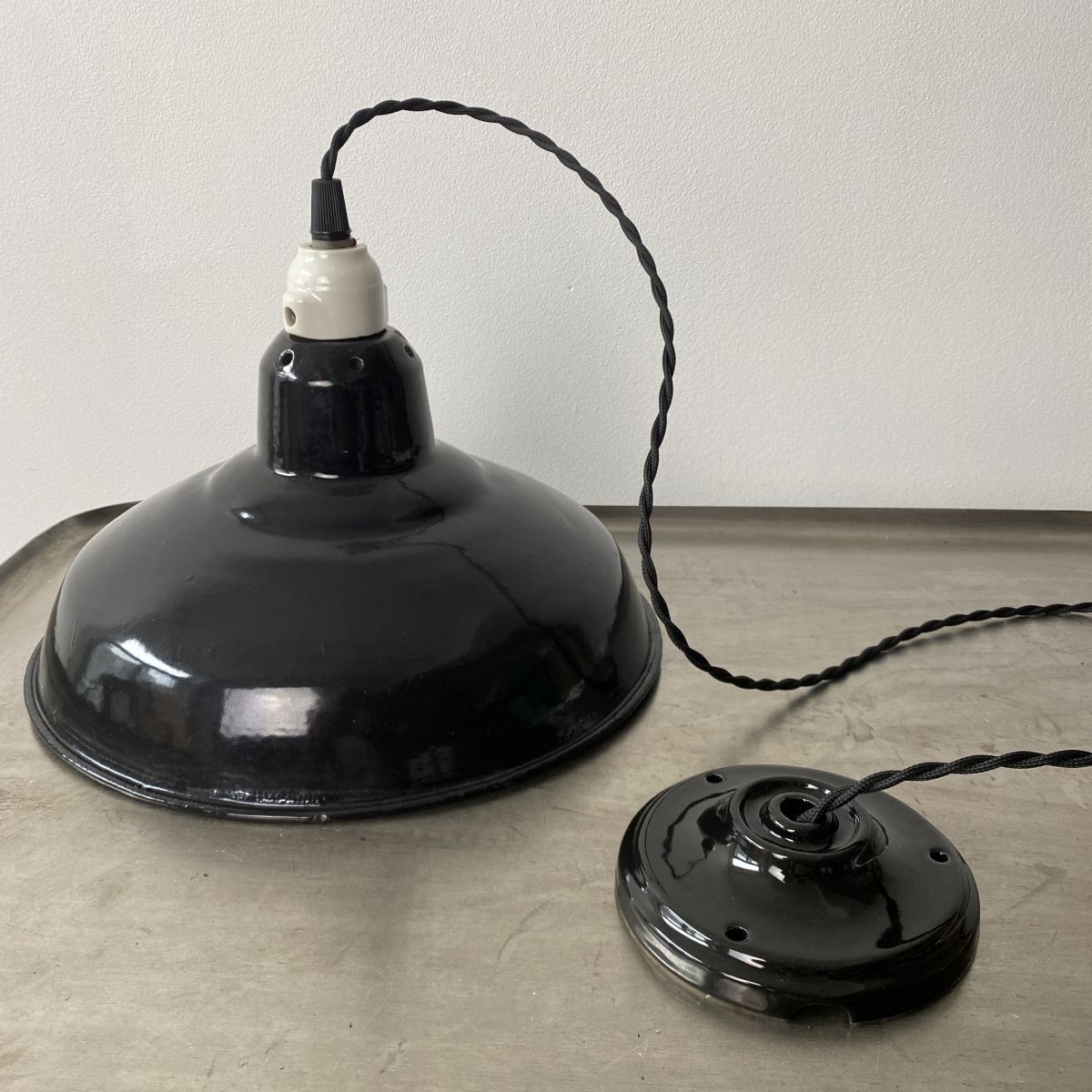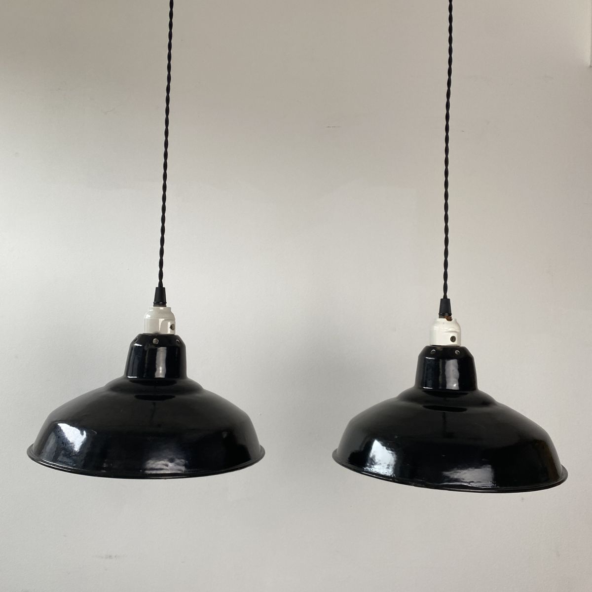 2 petites suspensions industrielles en tôle émaillée noire. Années 1960. En très bel état malgré des traces de rouilles et sauts d’émail.