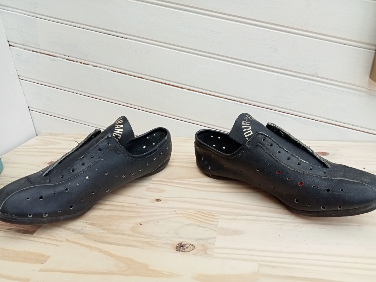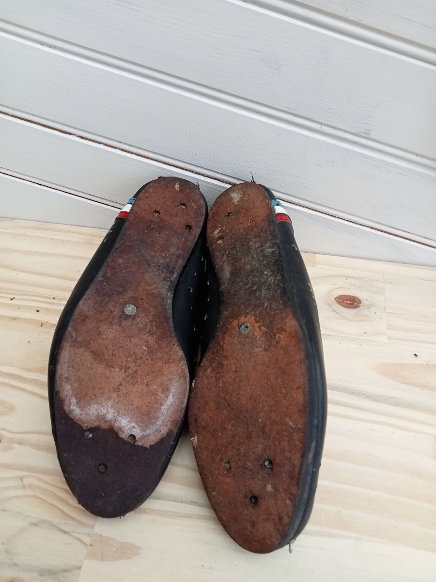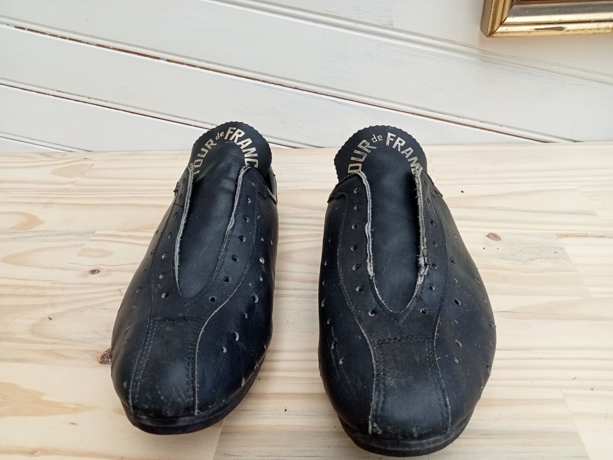 Magnifique chaussures vintages de cycliste en cuir noir des années 70/80 à l'effigie du Tour de France avec les liserés du drapeau Français.