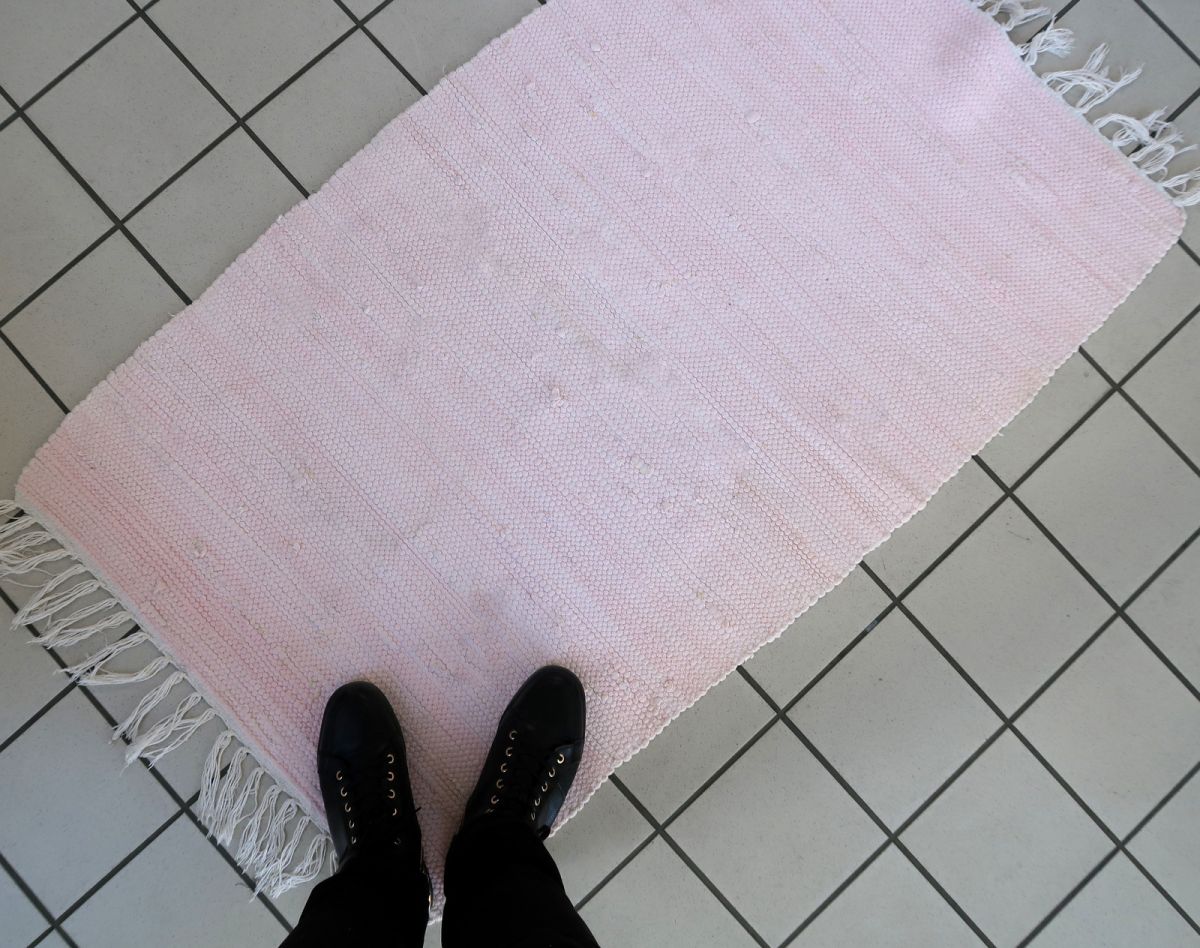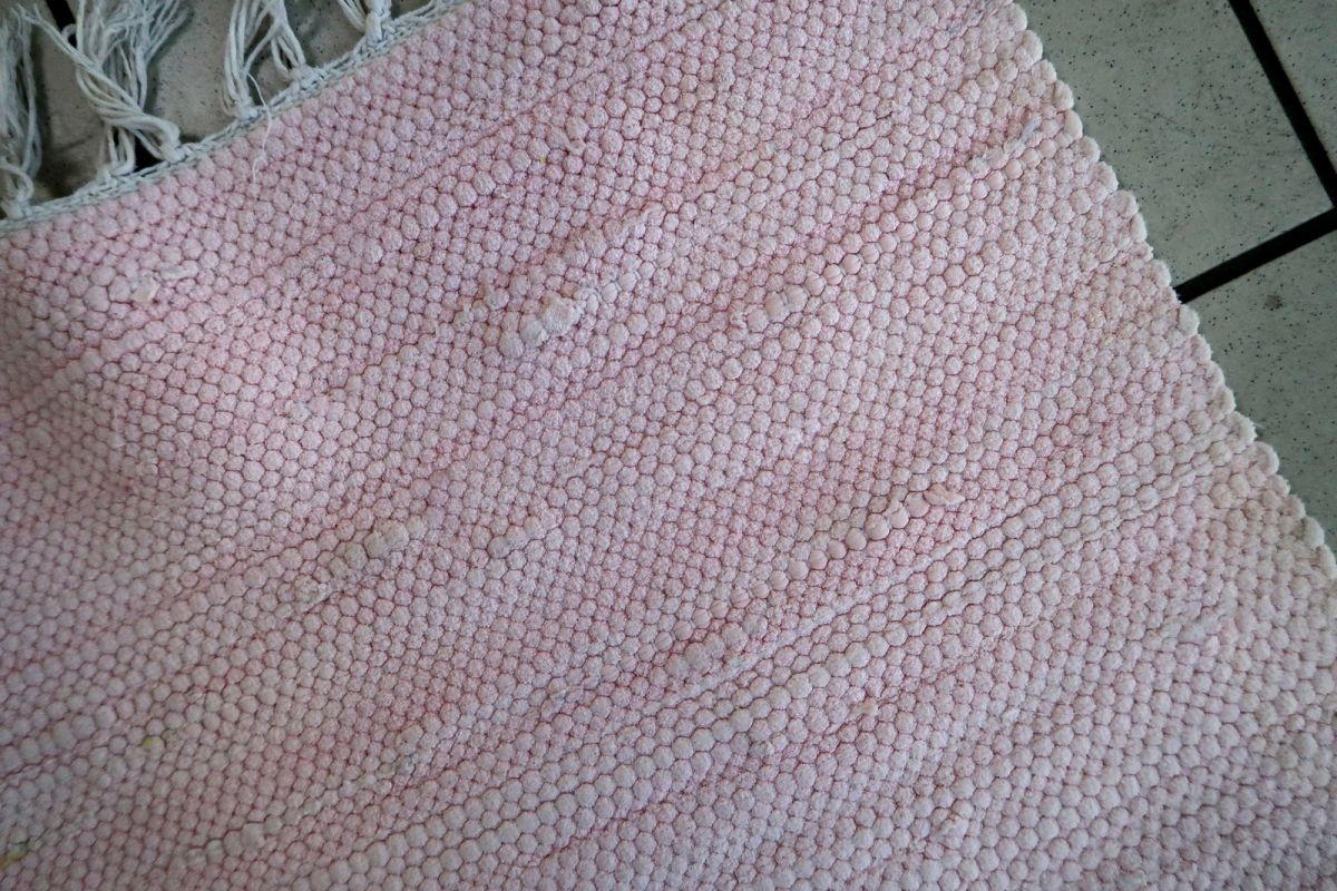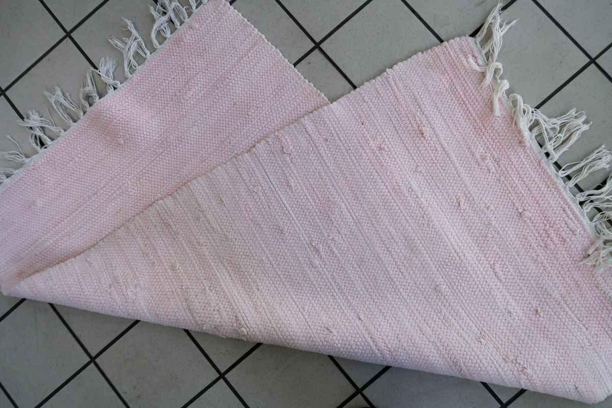 Handmade vintage kilim in original good condition. The kilim is in pink shade. It has been made out of cotton. Vert simple, plain design.