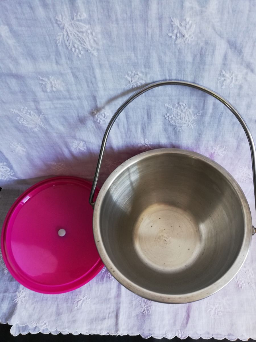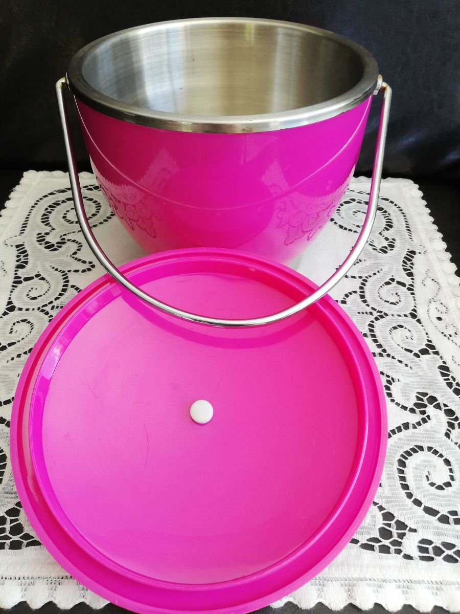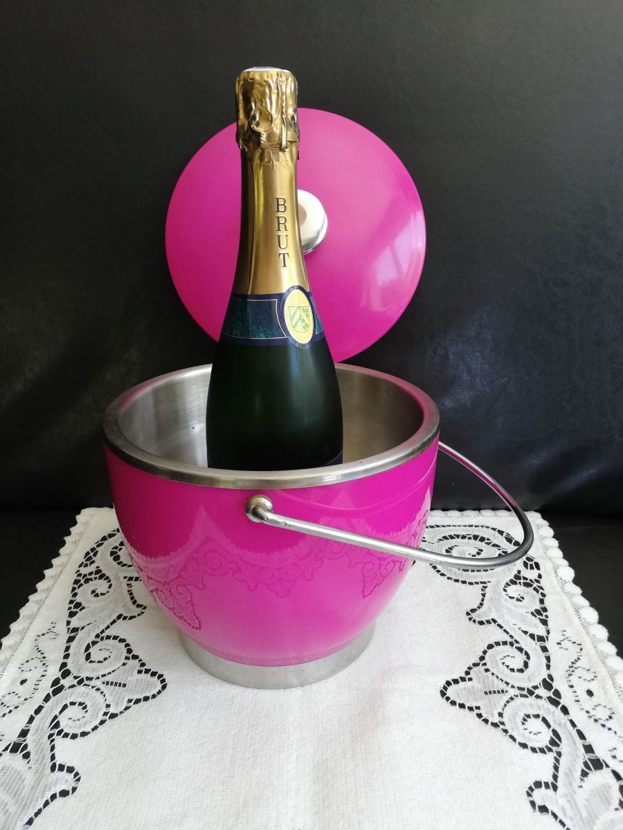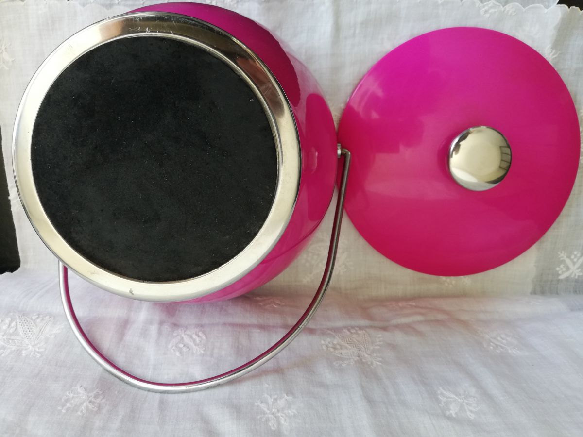 Seau à glace, rafraichissoir à bouteille vintage, intérieur, poignée et anse en inox, extérieur et couvercle en plastique rigide de couleur fuschia/magenta. Fond recouvert de mousse noire.