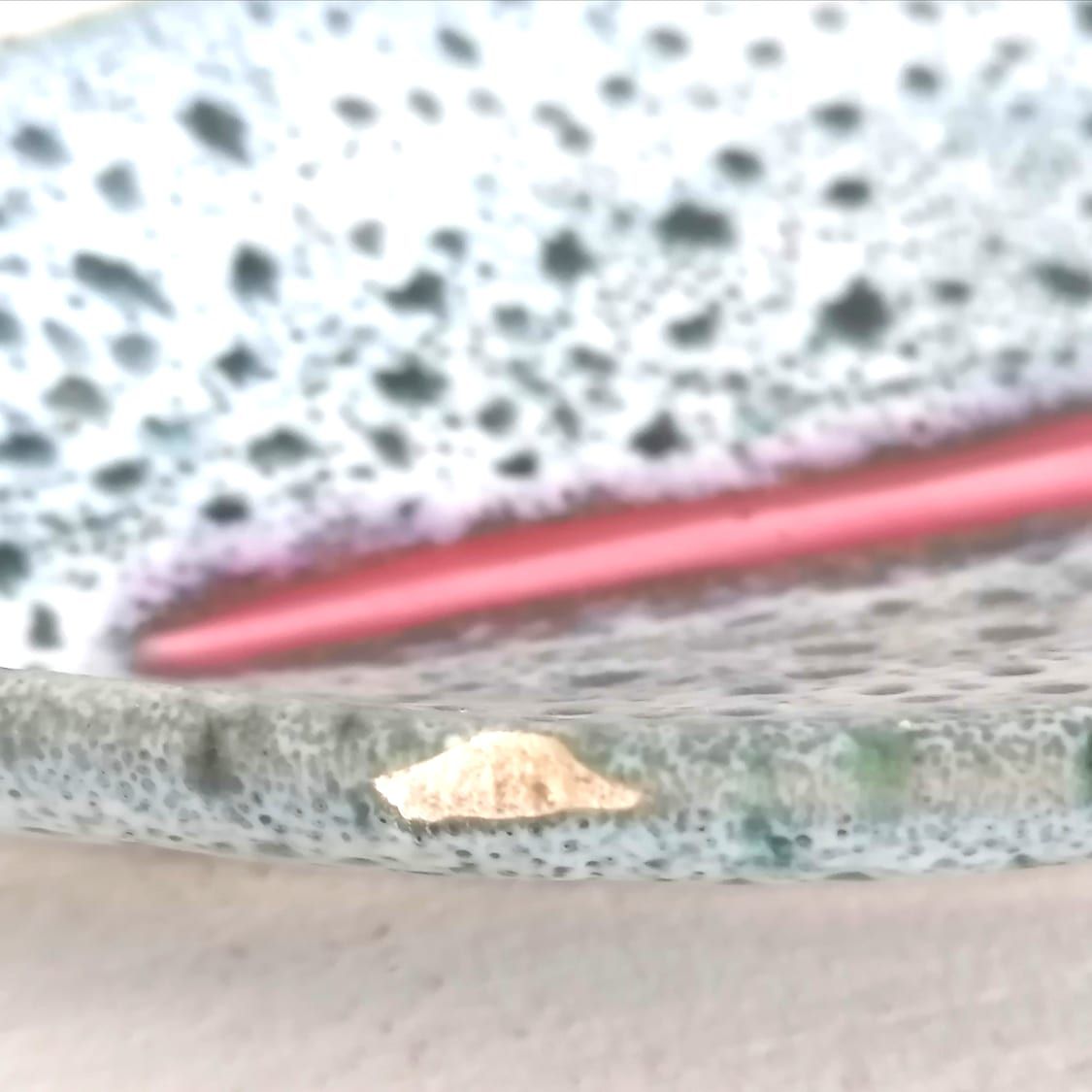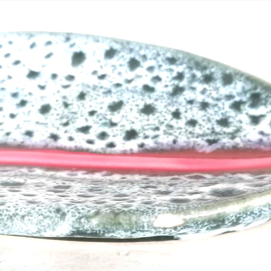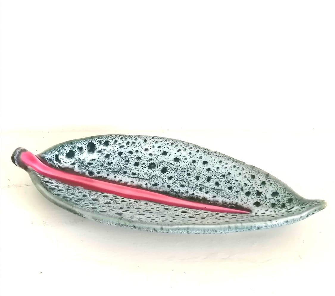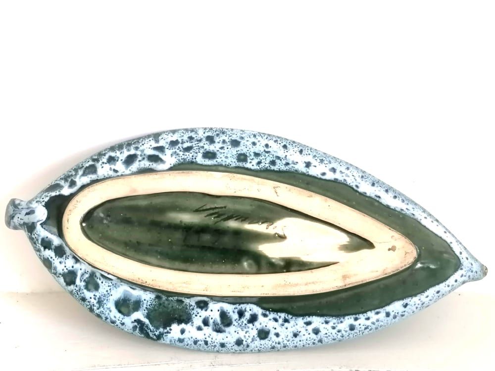 Vide poche en céramique signé Vallauris. Vide poche en céramique émaillée à décor style fat lava sur fond bleu gris, et nervure de la feuille en rose.