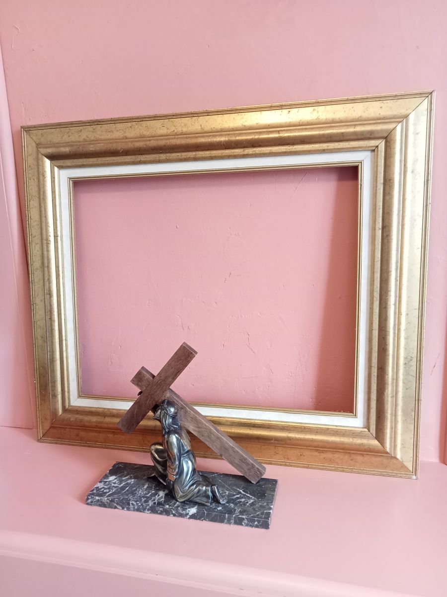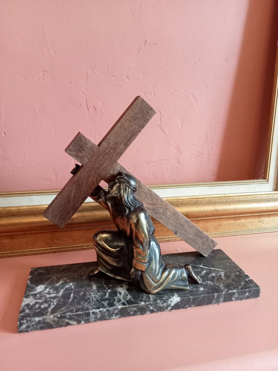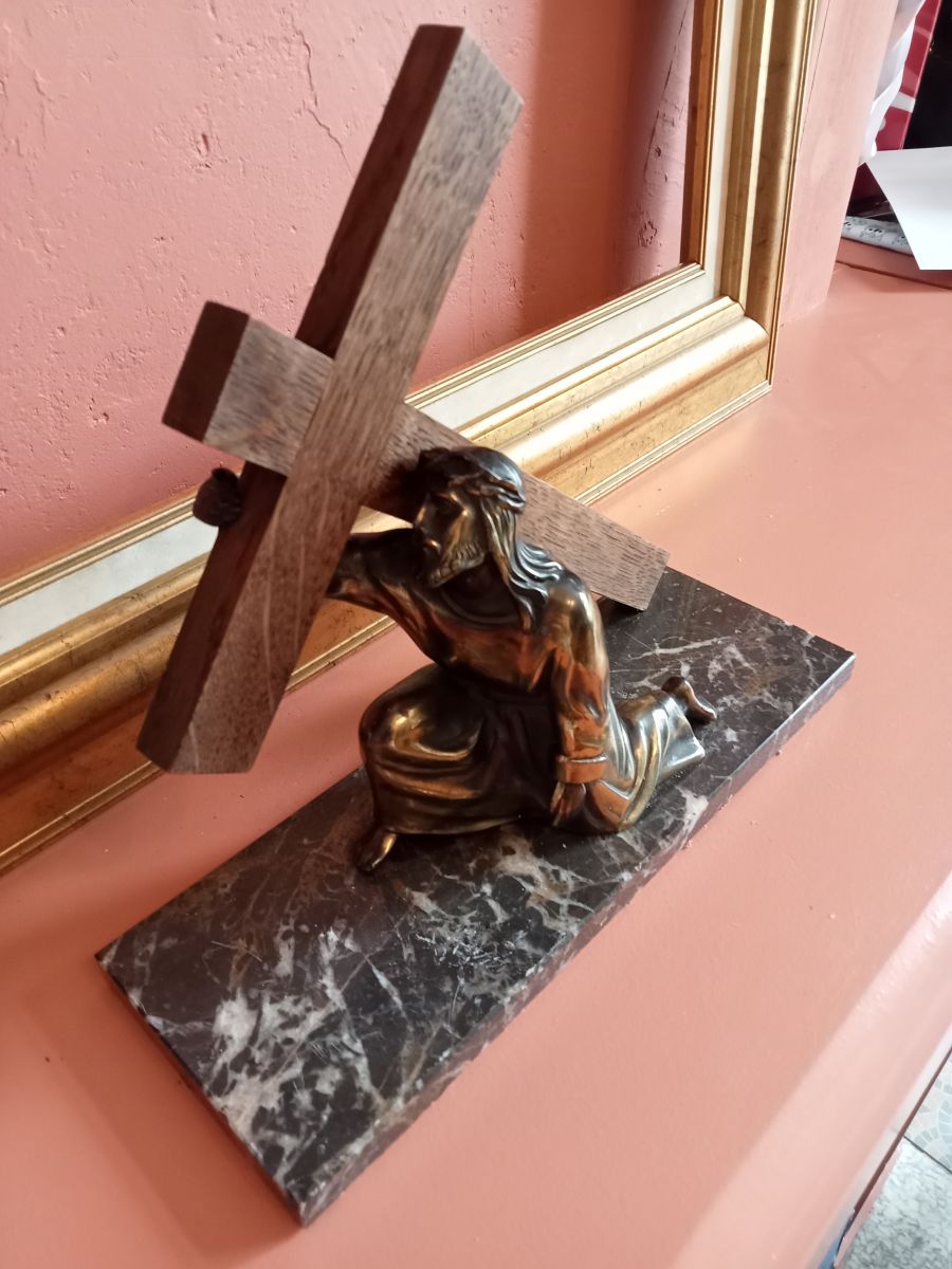 Belle statuette en régule sur un socle en marbre avec comme sujet Jésus-Christ portant sa croix en bois.