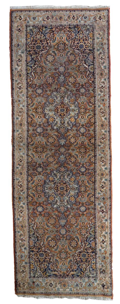 Handmade vintage Indian Tabriz runner in original condition, it has some signs of age. The rug has been made in in the end of 20th century in wool.