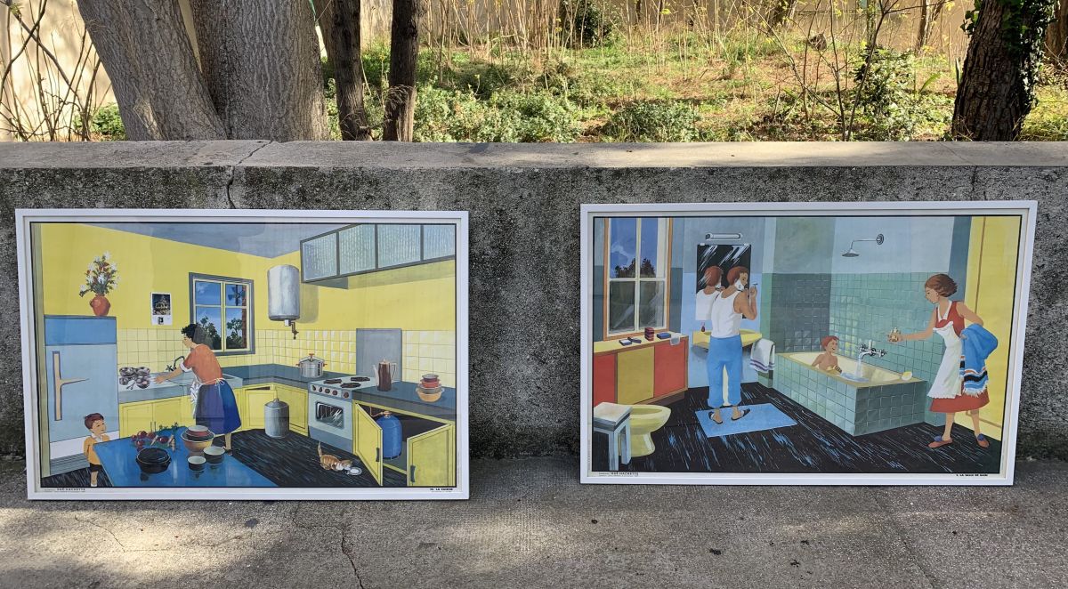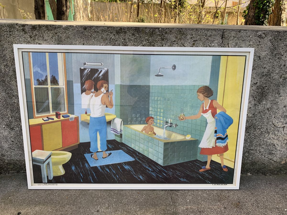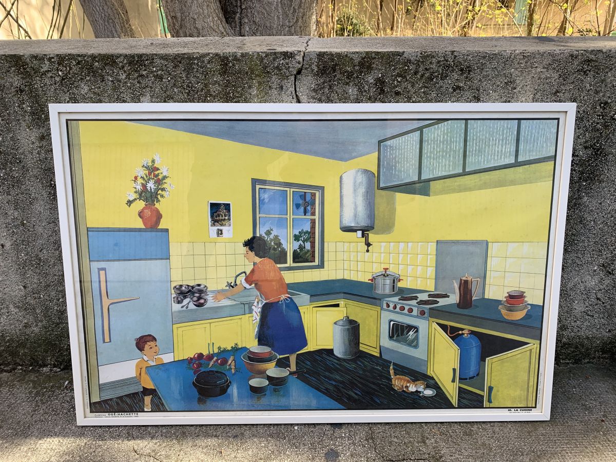 2 Tableaux d'affiches scolaires Rossignol des années 1950 - 1960 Coédition Ogé-Hachette, Illustrations de G.Bonmati et G.Michel, 2 Panneaux recto-verso soit 4 vues : 2-La Salle de Bain +17 : le grand magasin 10-La Cuisine + 4: La rue Parfaitement encadrées par un professionnel. Cadre blanc et affiche sous verre. Dimension des affiches : 100 cm X 65 cm