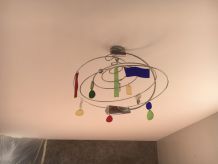 L’électricité a été refaite. Douille à baïonnette en céramique (Ampoules B22). Branchement par domino. Fil rouge en tissu tressé et rosace de fixation en porcelaine.