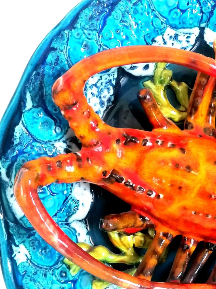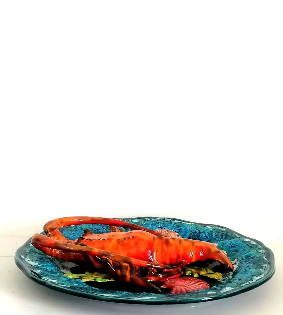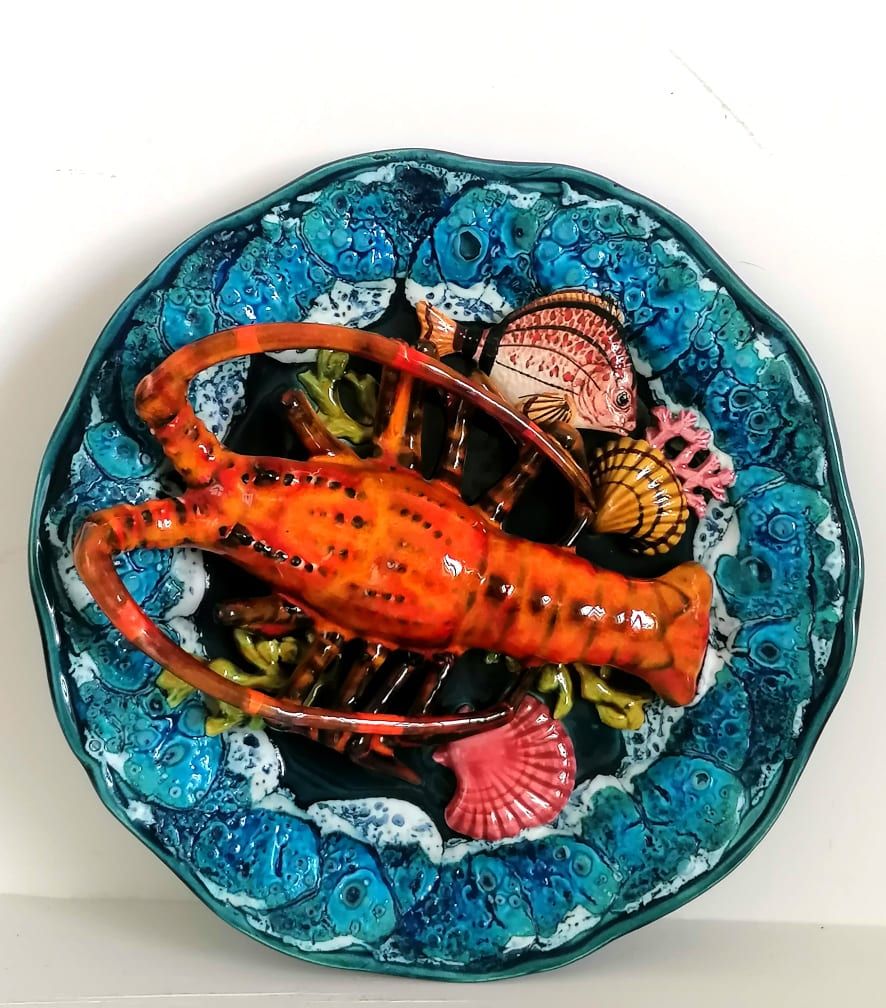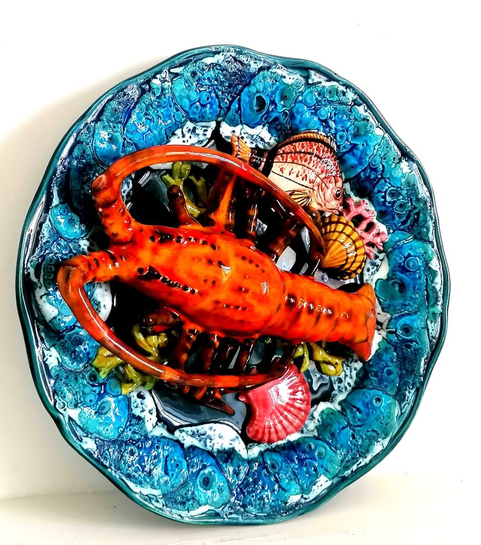 Rare assiette en faïence dans le style de Palissy, travail en trompe l’œil orné d'un homard dans son habitat naturel (algues, poissons, crustacés). Vers 1930 / 1950.