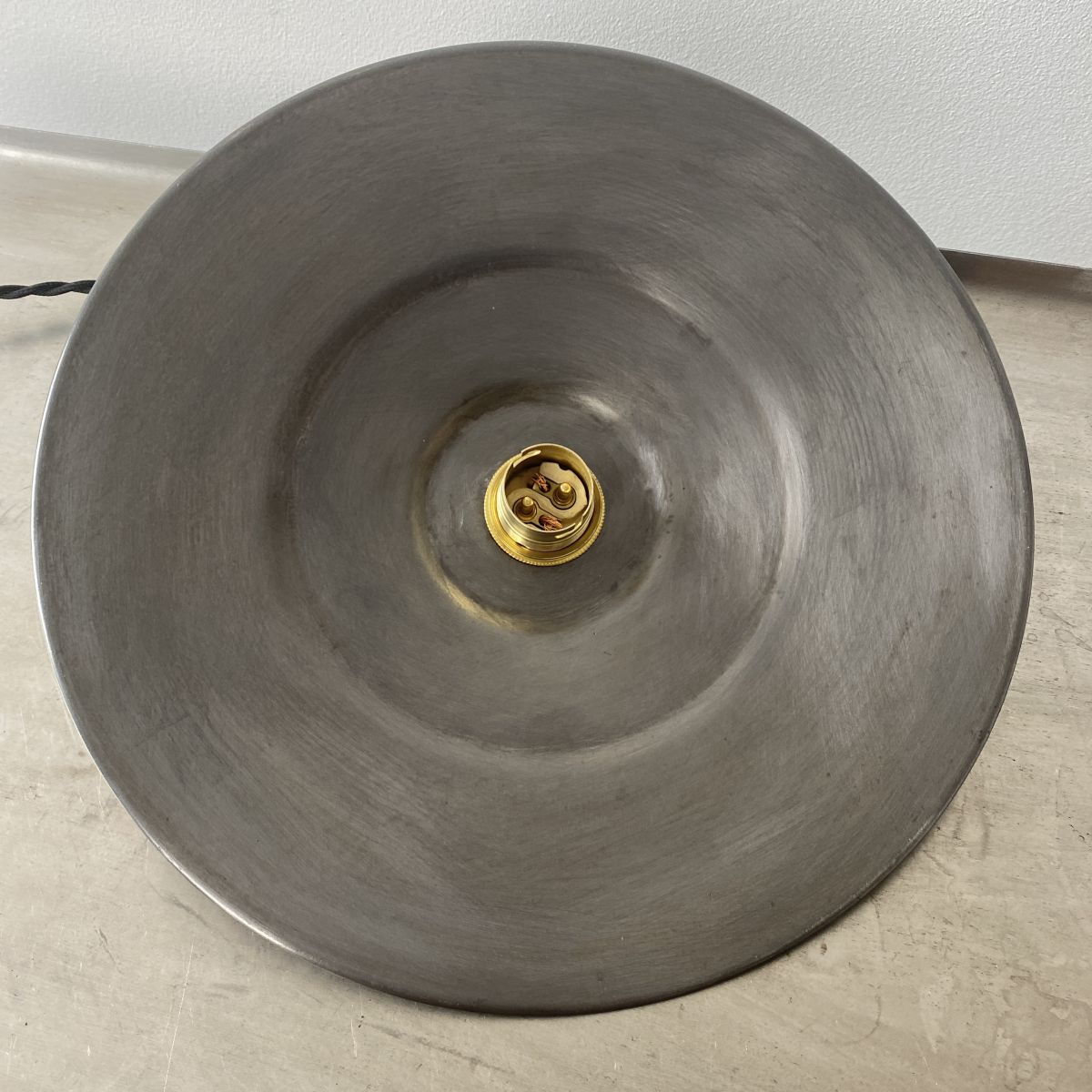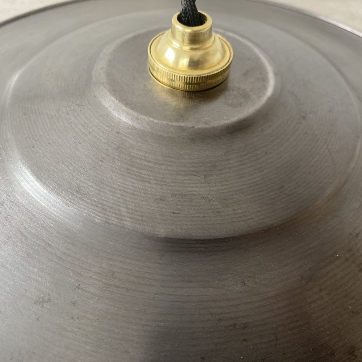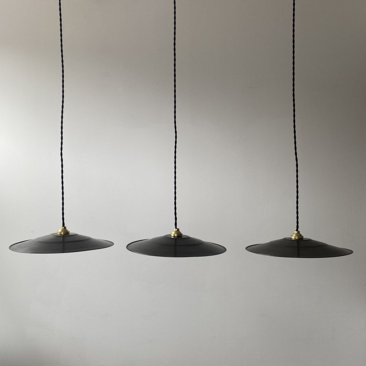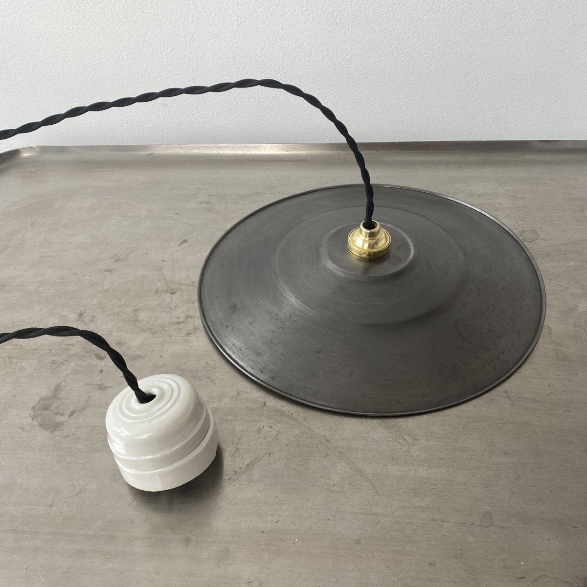 Elles ont été poncées et patinées ton anthracite. L’électricité a été refaite avec douille à baïonnette (Ampoules B22). Branchement par domino. Fil noir en tissu tressé et rosace de fixation en porcelaine.