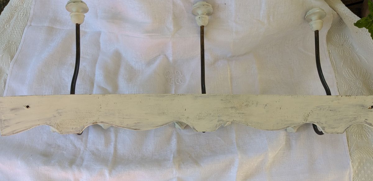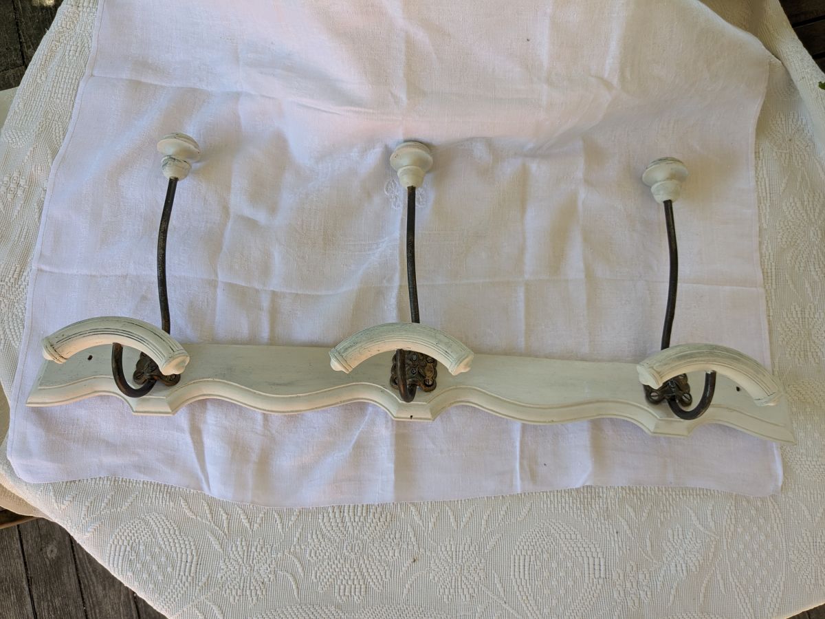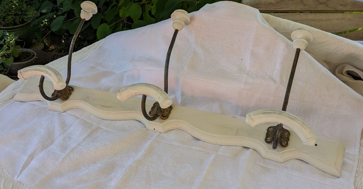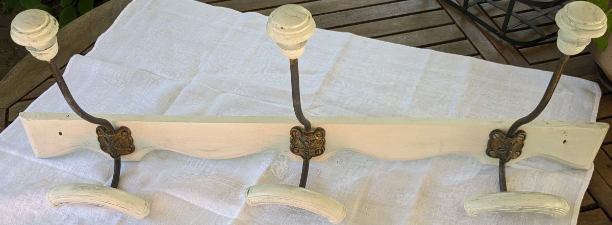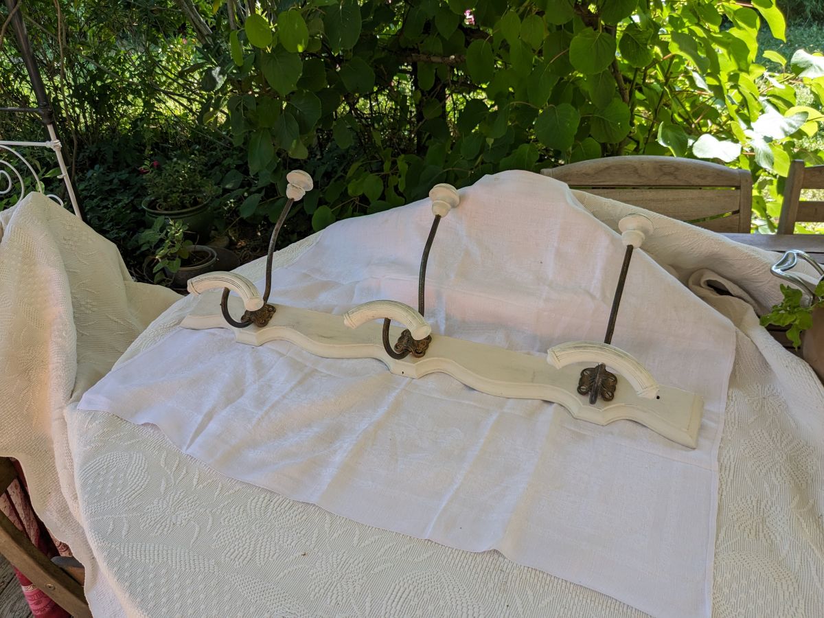 Trois patères. Porte-manteaux ancien relooké :repeint en blanc ivoire et patiné en gris bleuté très léger. Trous pour fixation au mur.