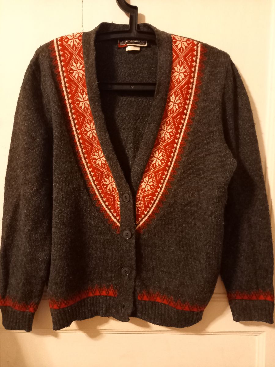 Pull cardigan en laine mélangée gris anthracite et bordure rouge