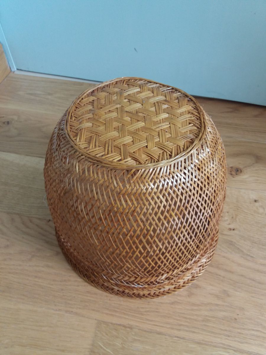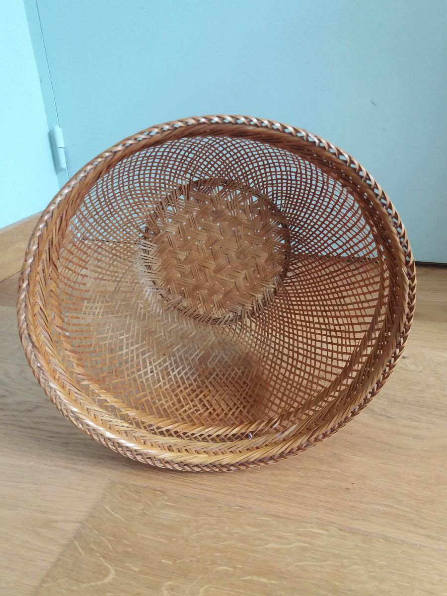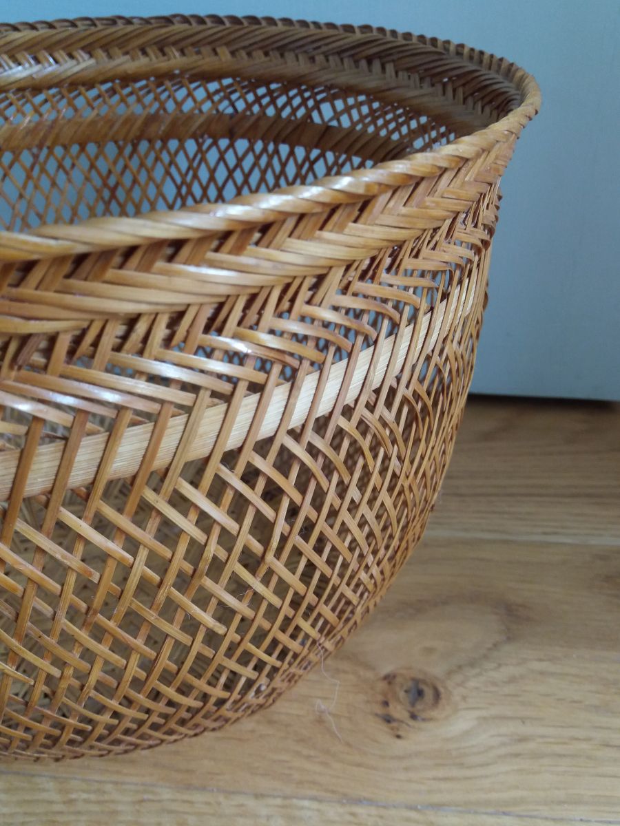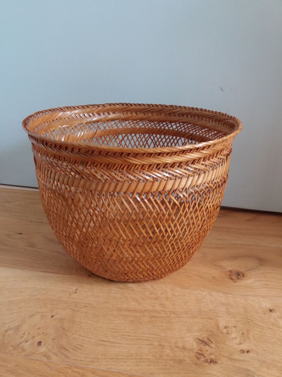 Jolie corbeille en fin tressage de brins plats d'osier blond doré vernis. Le tressage est largement ajouré, ce qui lui donne un air très aérien. Parfait pour contenir quelques bonnets, chapeaux, gants dans une entrée, il peut aussi servir de corbeille à papier, cache-pot... Il est en très bon état, pas de brin cassé, pas de tâche. Il est très léger, à peine plus de 120g. Il mesure environ 22 cm de hauteur et 28 cm de diamètre au niveau de l'ouverture.