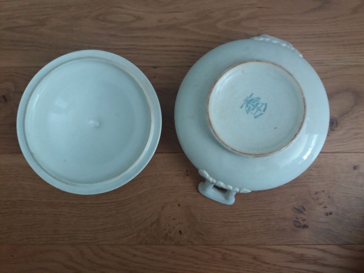 Jolie soupière très ancienne, de la manufacture Creil et Montereau, appartenant au service « Tolède », avec un joli décor peint bleu et rose et des trèfles en relief. Elle est toujours munie de son couvercle et c'est assez rare pour le souligner. On peut noter aussi la forme originale des poignées. Grace à l'estampille dessous et à un super site web sur les manufactures de faïence, j'ai pu dater précisément cette soupière : elle a été fabriquée entre 1894 et 1920. Elle est en bon état pour une soupière qui a plus de 100 ans ! Pas de manque ou de cassure. Mais elle ne cache pas son âge : de nombreuses taches sur l'émaillage craquelé, un peu à l'extérieur, et bien plus à l'intérieur, qui sont dues apparemment au gras qui se serait incrusté dans les craquelures au fil du temps (il paraît qu'on peut faire disparaître cela dans un bain de lait bouillant, mais je n'ai pas osé tester!), une fêlure à l'intérieur de la soupière, qui me paraît être superficielle, uniquement sur l'émaillage et des égrénures. Elle mesure 22 cm de diamètre maximal environ, 27 cm de largeur avec les anses, 14 cm environ de hauteur (couvercle compris). Elle pèse environ 1, 4 kg.