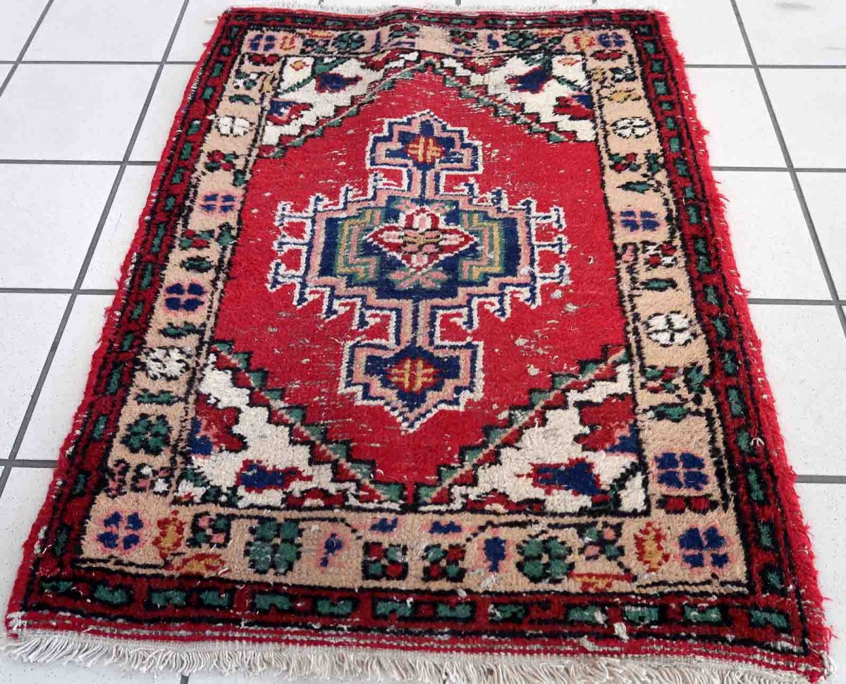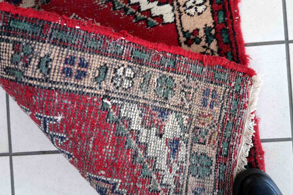Handmade vintage Persian Hamadan rug in distressed condition. The rug has been made in wool in the end of 20th century.