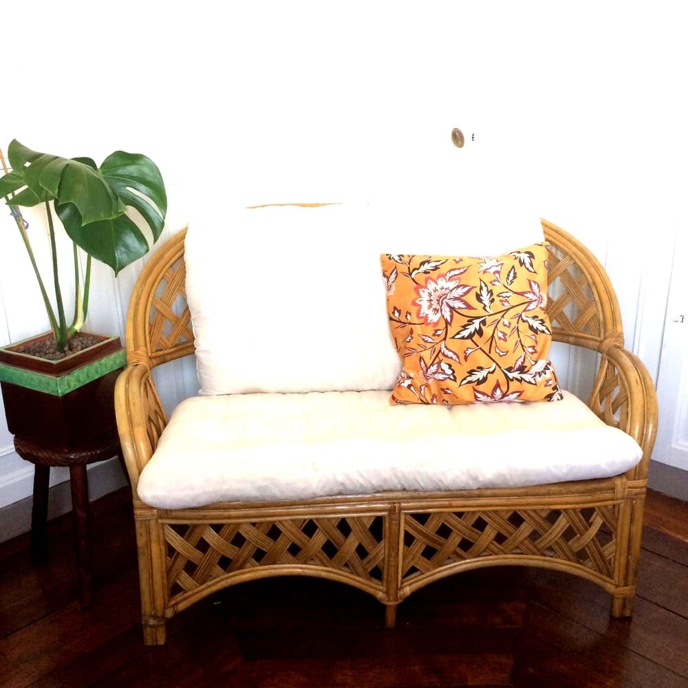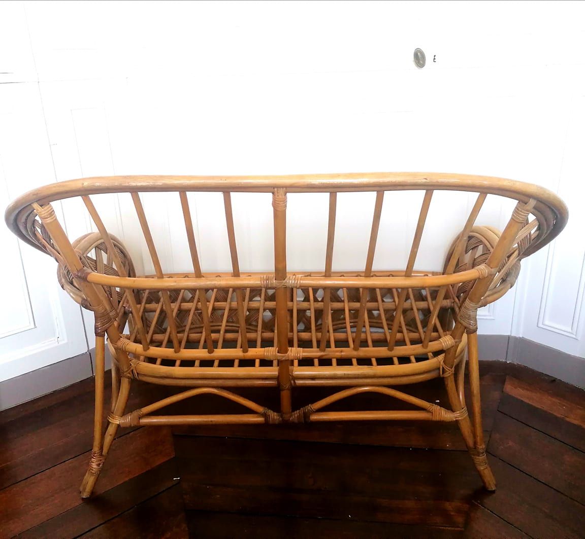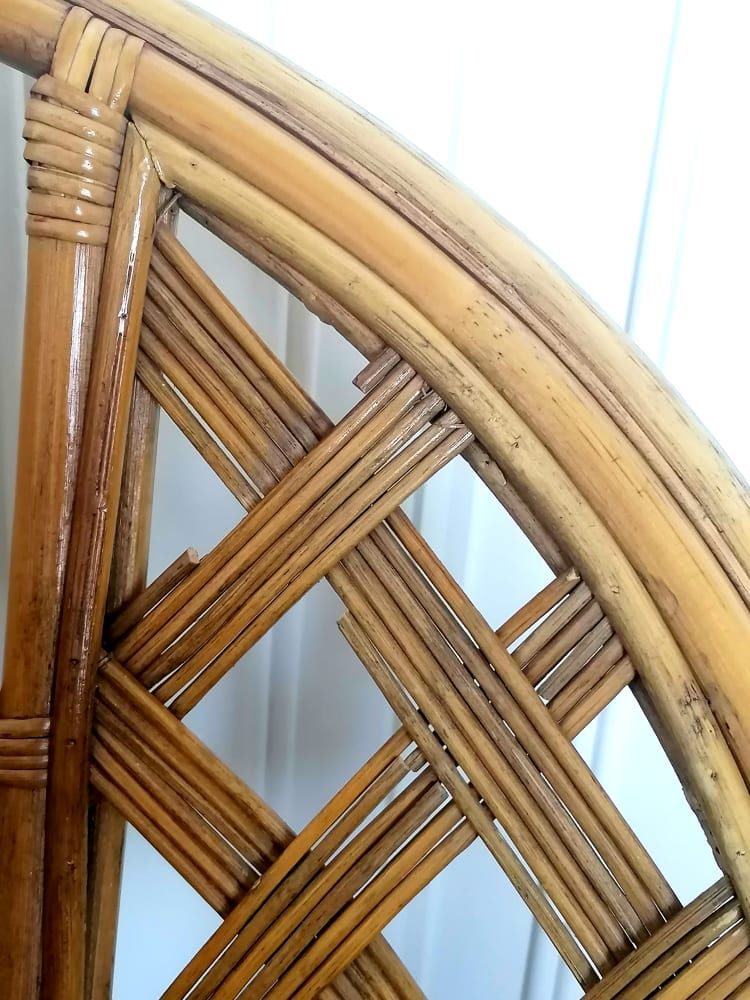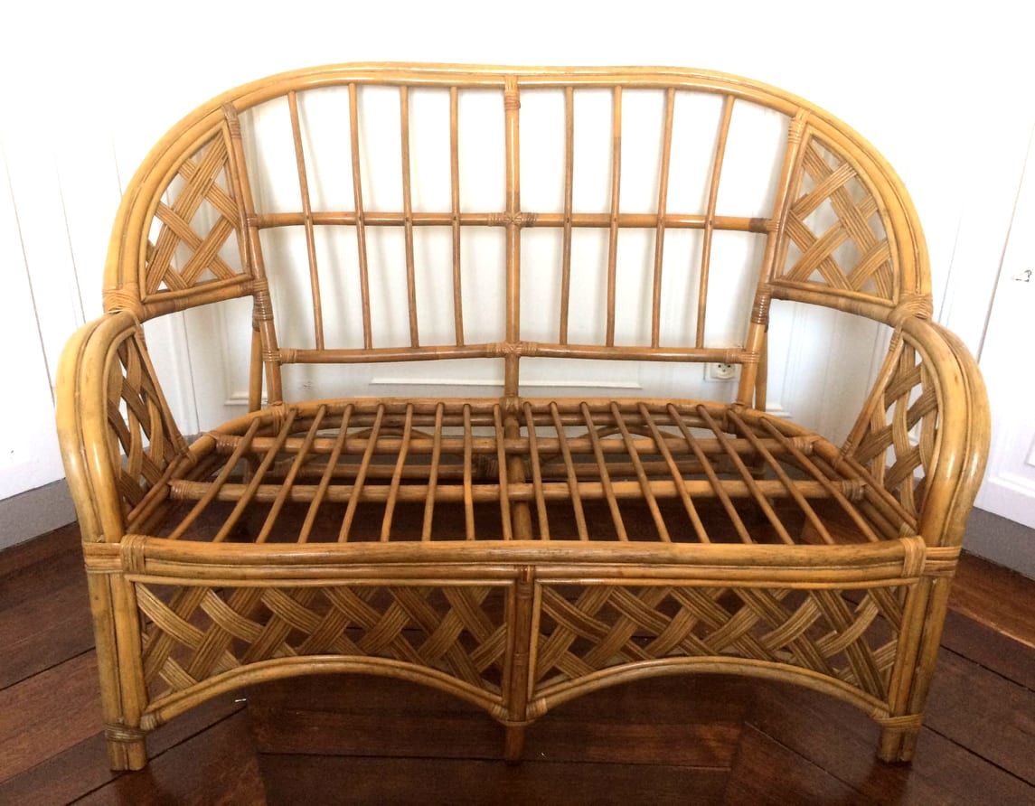 Assise et dossier composé de tiges de bambou. Décor de rotin en croisillons aux pieds et accoudoirs.