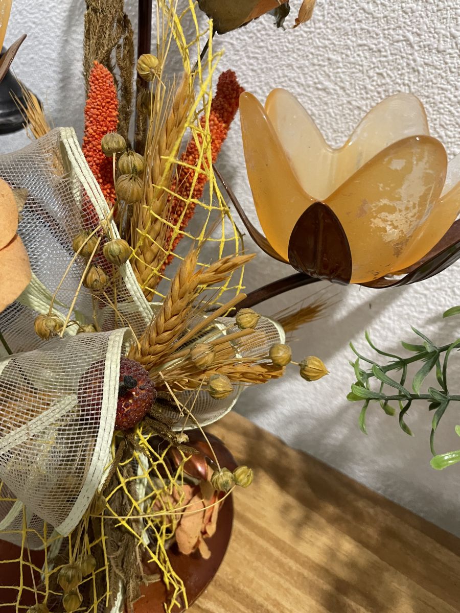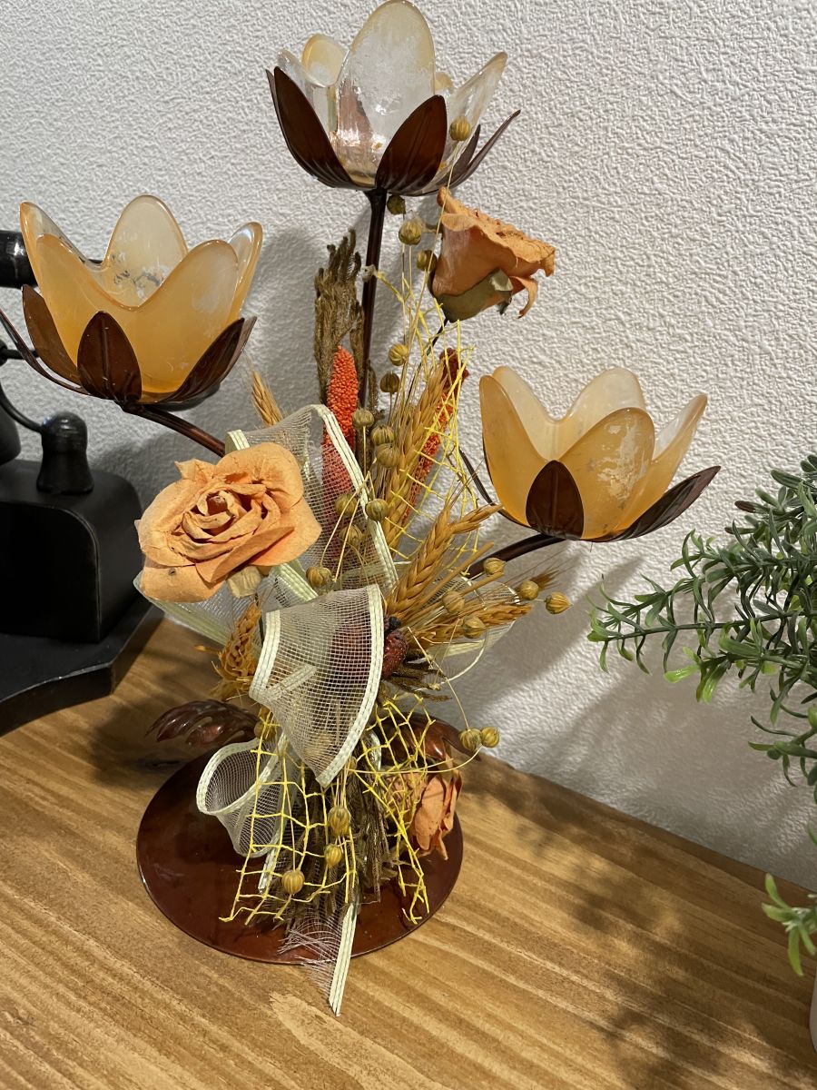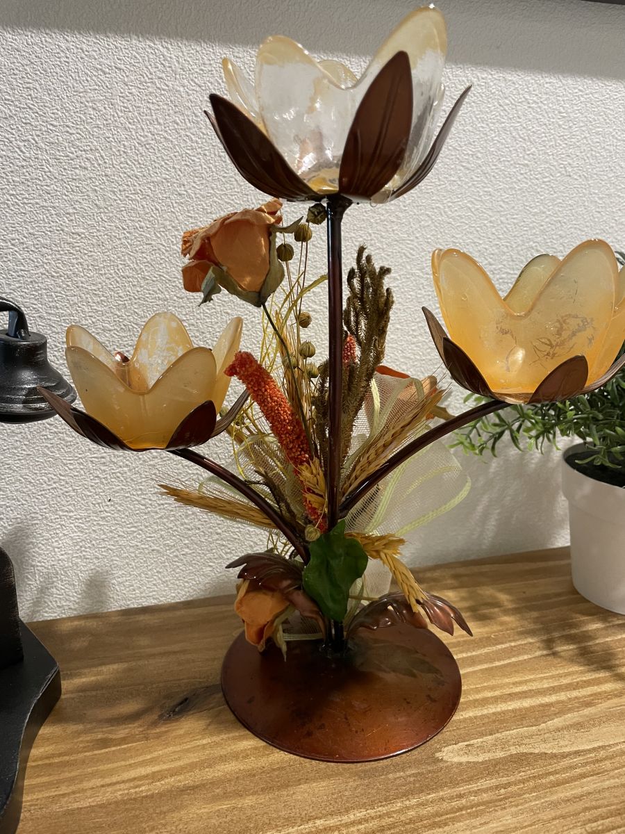 Très joli bougeoir à structure métallique, les coupelles sont en verres , la composition florale est constituée de végétaux séchées, de tulle (à noter un petit trou mais très discret pouvant être caché en y collant une feuille ou autre), de matières diverses.