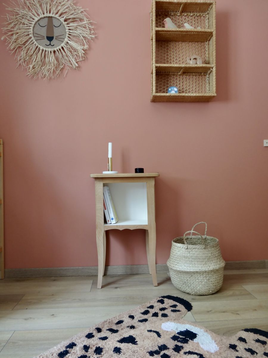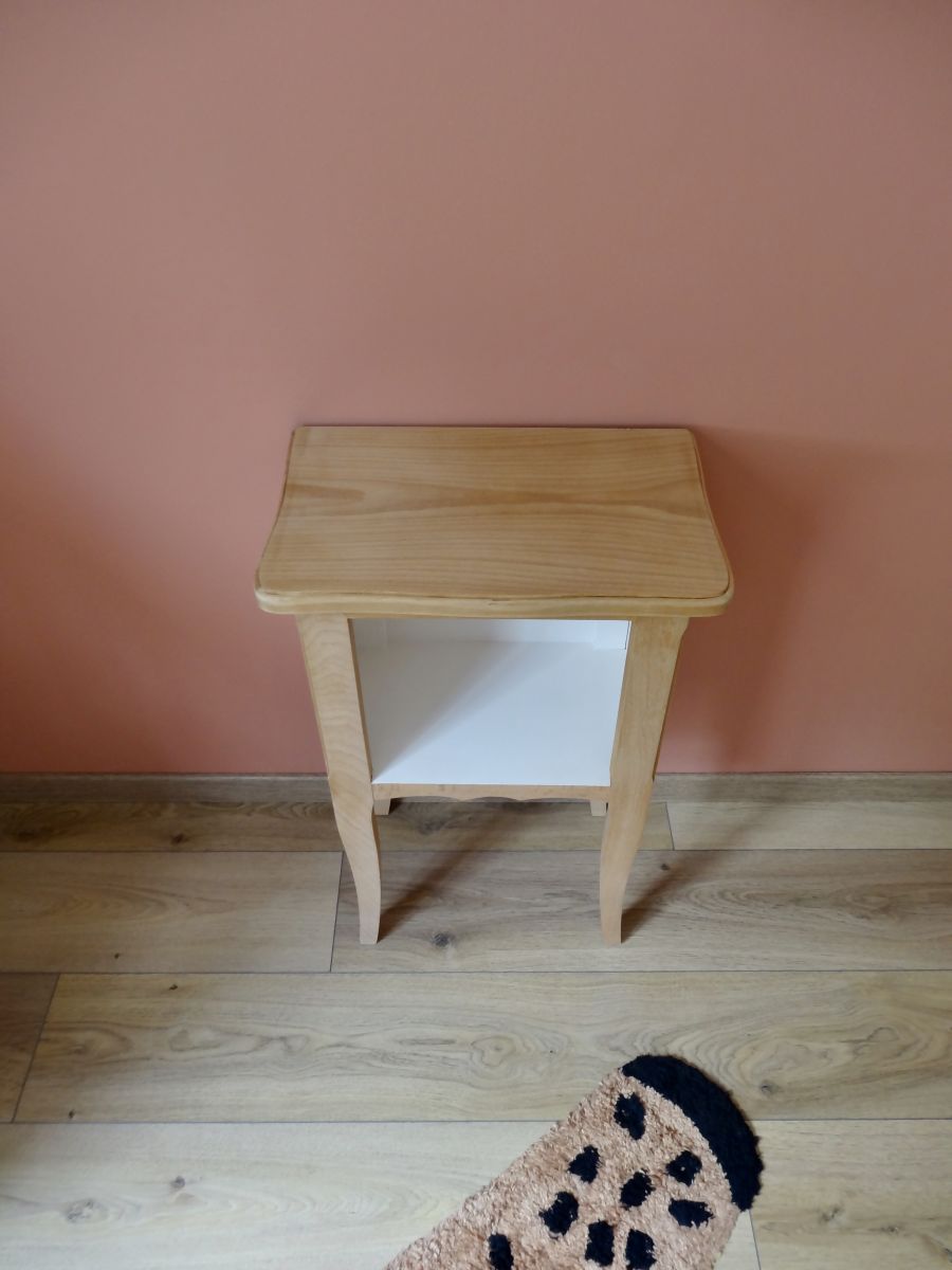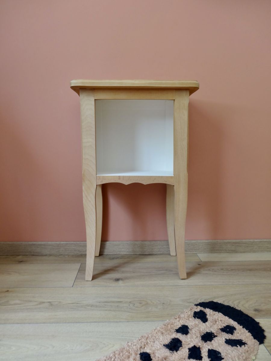 Table de chevet en hêtre massif et placage. Intérieur et cotés peints dans un blanc cassé.