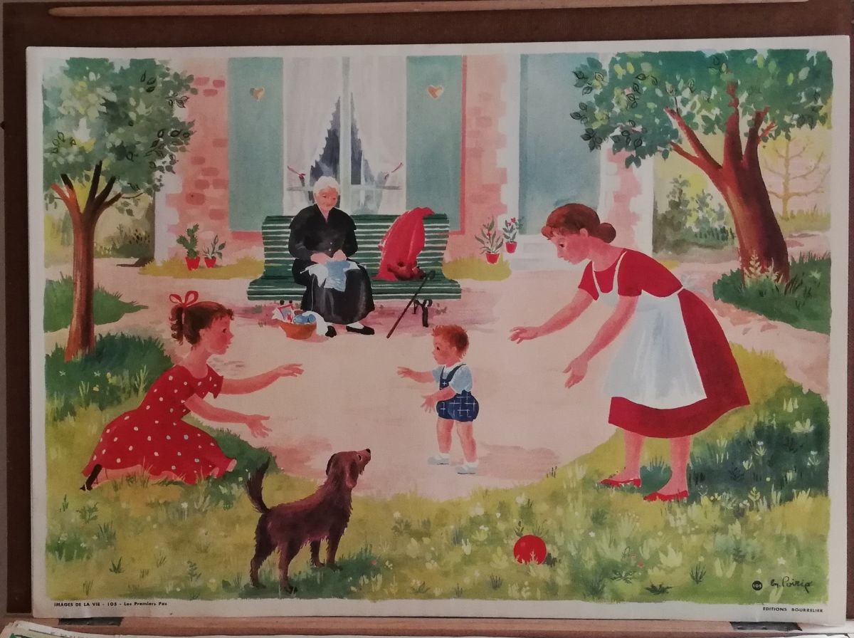 Les premiers pas. Affiche scolaire vintage de la collection "images de la vie" 105. Bourrelier, ln poirié. 75 X 53 cm. Très bon état. Envoi sous rouleau de préférence en mondial relay pour éviter le surcoût du colissimo.