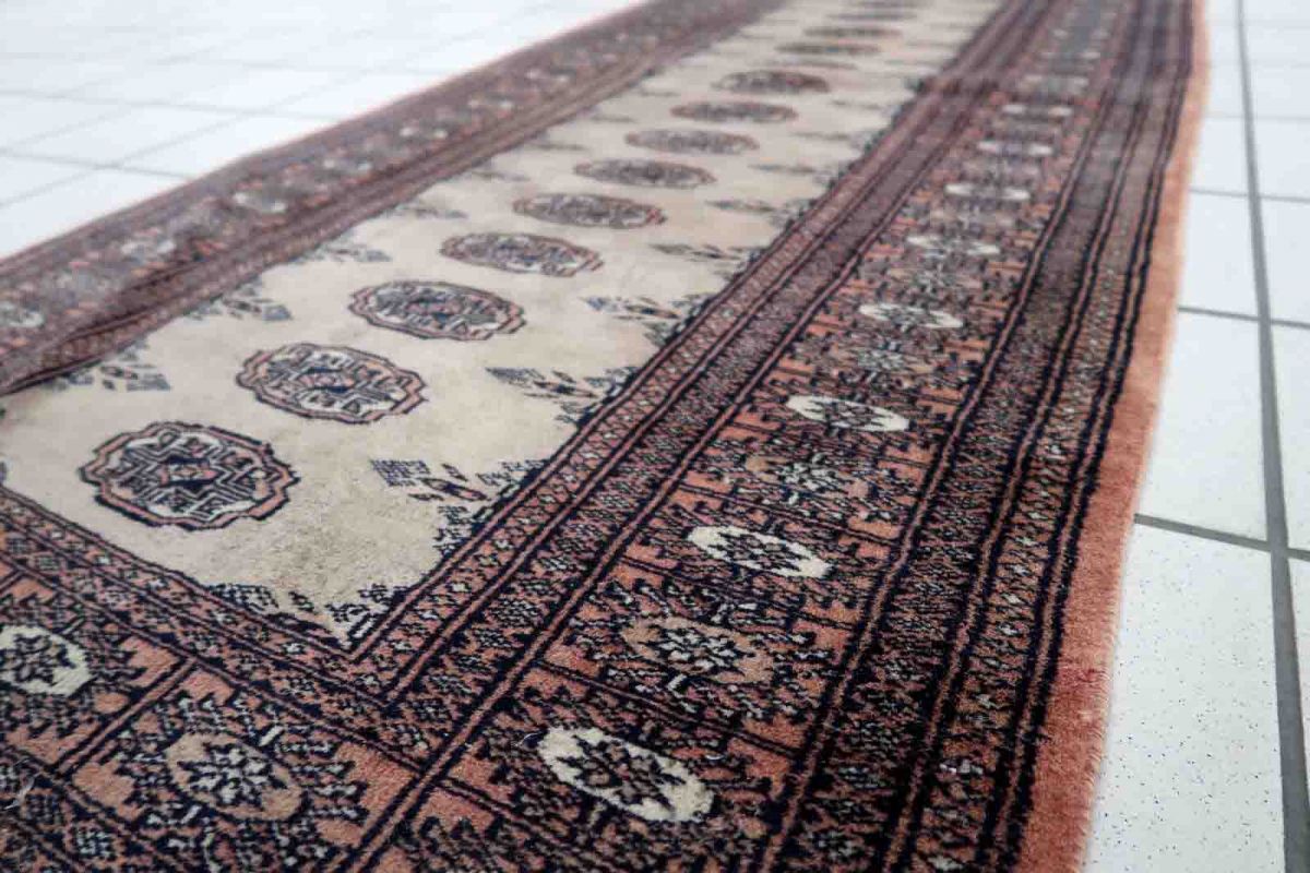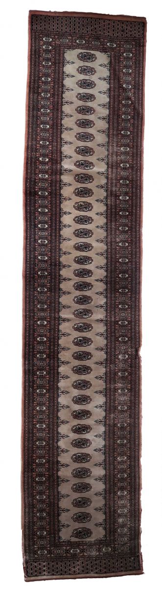 Handmade vintage Uzbek Bukhara distressed runner in traditional design. The rug is from the end of 20th century made in wool.